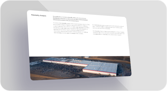Materiality Analysis We conducted our first-ever materiality analysis, the results of which identified key areas that our stakeholders said they cared about and are reflected in the content of this year’s Impact Report. To conduct the materiality analysis, we surveyed key stakeholders for Tesla, Our stakeholders also want us to use industry best practices in a variety of including Tesla’s Board of Directors, operational leadership, employees, ways – from human rights, to mining and recycling, to vehicle capacity suppliers, investors and customers, as well as state and local policymakers, expansion and new factory construction. to understand which ESG topics these groups find most relevant to our business. Environmental impact is a front-and-center theme for Our discussions of each of these themes are listed in our Table of Contents stakeholders, who are advocating for emissions reductions in both our on the next page, and we dive into the details throughout this report. More manufacturing processes and the charging of Tesla vehicles. information about our materiality survey can be found on page 84. 3