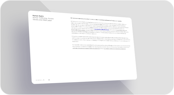Human Rights We have a zero-tolerance policy when it comes to child or forced labor and human trafficking by our suppliers Human Trafficking, Modern Slavery and Child Labor At Tesla, we are committed to ensuring that the way we conduct our business and dealings with our suppliers reflects our values and our belief that everyone should be treated with dignity and respect. Tesla is committed to ensuring that our suppliers do not use slave or child labor or engage in human trafficking. Modern slavery, child labor and human trafficking are crimes under the laws of countries throughout the world, but unfortunately continue to exist all over the globe. Our commitment on this front is summarized in the Tesla Supplier Code of Conduct as well as in our Human Rights Policy and Responsible Materials Policy, and we continue to work to ensure that our suppliers uphold the principles in these statements. We look to the OECD Due Diligence Guidelines to inform our process and use feedback from our internal and external stakeholders to find ways to continually improve it. Through our commitment to enforce our Supplier Code of Conduct, Human Rights Policy and Responsible Materials Policy, continuous training and the supplier audit and due diligence efforts, Tesla believes that there is minimal risk of, and have found no evidence to date of Tesla causing, contributing to or being linked to modern slavery, child labor or human trafficking in our supply chain. For more information on our commitment to anti-slavery practices and an affirmation of the values we hold and adopt across Tesla’s business operations and supply chain, including how we assess risks and effectiveness of our actions, please see our California Transparency in Supply Chain Acts Statement and our U.K. Modern Slavery Act Transparency Statement. 58