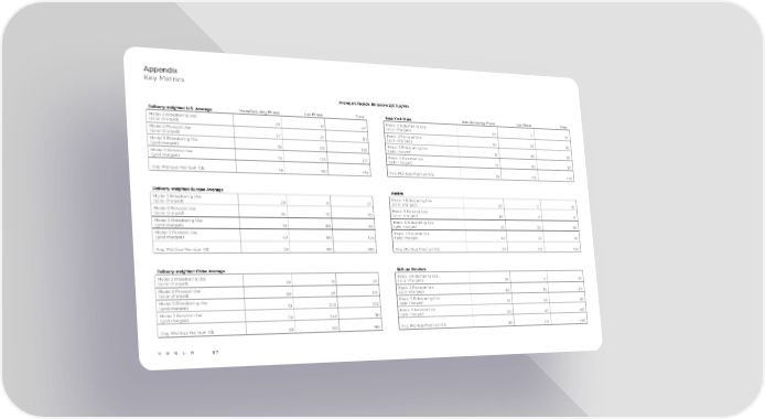 Appendix Key Metrics Average Lifecycle Emissions (gCO e/mi) 2 Delivery-weighted U.S. Average Manufacturing Phase Use Phase Total New York State Manufacturing Phase Use Phase Total Model 3 Ridesharing Use Model 3 Ridesharing Use (solar charged) 29 0 29 (solar charged) 29 0 29 Model 3 Personal Use Model 3 Personal Use (solar charged) 67 24 91 (solar charged) 67 16 82 Model 3 Ridesharing Use Model 3 Ridesharing Use (grid charged) 10 125 135 (grid charged) 10 80 90 Model 3 Personal Use Model 3 Personal Use (grid charged) 52 125 177 (grid charged) 52 80 131 Avg. Mid-Size Premium ICE 45 401 446 Avg. Mid-Size Premium ICE 45 401 446 Delivery-weighted Europe Average Austria Model 3 Ridesharing Use Model 3 Ridesharing Use (solar charged) 29 0 29 (solar charged) 29 0 29 Model 3 Personal Use Model 3 Personal Use (solar charged) 84 13 70 (solar charged) 84 6 41 Model 3 Ridesharing Use Model 3 Ridesharing Use (grid charged) 10 60 96 (grid charged) 10 30 90 Model 3 Personal Use Model 3 Personal Use (grid charged) 69 60 128 (grid charged) 69 30 99 Avg. Mid-Size Premium ICE 59 401 460 Avg. Mid-Size Premium ICE 59 401 460 Delivery-weighted China Average Sichuan Province Model 3 Ridesharing Use Model 3 Ridesharing Use (solar charged) 29 0 29 (solar charged) 29 0 29 Model 3 Personal Use Model 3 Personal Use (solar charged) 80 99 179 (solar charged) 80 16 50 Model 3 Ridesharing Use Model 3 Ridesharing Use (grid charged) 10 242 252 (grid charged) 10 40 96 Model 3 Personal Use Model 3 Personal Use (grid charged) 69 242 311 (grid charged) 69 40 109 Avg. Mid-Size Premium ICE 59 401 460 Avg. Mid-Size Premium ICE 59 401 460 87