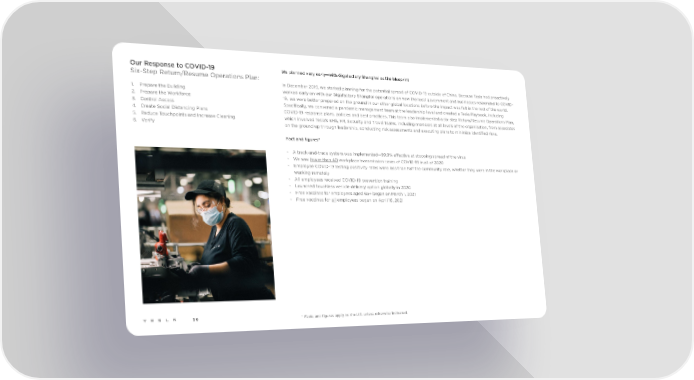 Our Response to COVID-19 We planned very early—with Gigafactory Shanghai as the blueprint Six-Step Return/Resume Operations Plan: In December 2019, we started planning for the potential spread of COVID-19 outside of China. Because Tesla had proactively 1. Prepare the Building worked early on with our Gigafactory Shanghai operations on how the local government and businesses responded to COVID- 2. Prepare the Workforce 19, we were better prepared on the ground in our other global locations before the impact was felt in the rest of the world. 3. Control Access Specifically, we convened a pandemic management team at the leadership level and created a Tesla Playbook, including 4. Create Social Distancing Plans COVID-19 response plans, policies and best practices. This team also implemented a six-step Return/Resume Operations Plan, 5. Reduce Touchpoints and Increase Cleaning which involved Tesla’s EHS, HR, Security and Travel teams, including members at all levels of the organization, from associates 6. Verify on the ground up through leadership, conducting risk assessments and executing plans to minimize identified risks. Fact and figures* • A track-and-trace system was implemented—99.9% effective at stopping spread of the virus • We saw fewer than 40 workplace transmission cases of COVID-19 in all of 2020 • Employee COVID-19 testing positivity rates were less than half the community rate, whether they were in the workplace or working remotely • All employees received COVID-19 prevention training • Launched touchless vehicle delivery option globally in 2020 • Free vaccines for employees aged 65+ began on March 1, 2021 • Free vaccines for all employees began on April 16, 2021 56 * Facts and figures apply to the U.S. unless otherwise indicated.