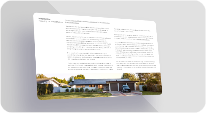 Introduction The very purpose of Tesla’s existence is to accelerate the world’s transition Focusing on What Matters to sustainable energy. The objective of an Environmental, Social and Governance (ESG) impact affordability and accessibility of our products. All these themes will be report is to disclose the impact a company has on those three areas, as covered in this year’s Impact Report. well as to present, to the extent possible, data and other information qualifying and quantifying that impact. Tesla aspires to do the right thing, and we are constantly looking for ways to do better. If you have suggestions about how our company can improve At Tesla, we strive to be the best on every metric relevant to our mission to in any way, feel free to send your ideas to impactreport@tesla.com. accelerate the world’s transition to sustainable energy. In order to maximize our impact, we plan to continue increasing our production Finally, it is important to note that current ESG evaluation methodologies volumes and the accessibility of our products. In more concrete terms, this tend to use a generic template to analyze every manufacturing company’s means that by 2030 we are aiming to sell 20 million electric vehicles per carbon footprint. Vehicle use phase, which realistically accounts for 80- year (compared to 0.5 million in 2020) as well as to deploy 1,500 GWh of 90% of total automotive emissions (included in Scope 3 of ESG reporting) energy storage per year (compared to 3 GWh in 2020). is repeatedly underreported. As use phase reporting guidelines remain vague, OEMs often use unrealistic assumptions for lifetime mileage and If we were to achieve such a vehicle delivery milestone through a unrealistic fuel consumption figures rather than real-world figures. As a consistent growth rate, the total Tesla vehicle fleet would surpass tens of result, it is not uncommon for the carbon footprint of the use phase to be millions of vehicles by 2030 and each of those vehicles could save tons of underreported by up to 50%. CO2from being emitted every year of usage. Our estimates in this report use real-world mileage and real-world energy Furthermore, each product we make must be continuously improved at consumption data sourced from our fleet of over one million cars on the each step of its lifecycle: from manufacturing to consumer use to recycling. road to calculate greenhouse gas (GHG) savings. We believe that reporting We must also improve every metric, including the energy and water used use phase emissions based on real-world fleet data should become an ESG to make our products, how safe our customers and employees are and the standard. 2