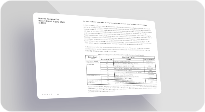 How We Managed Our Any of our suppliers or sub-suppliers sourcing from the DRC must exclusively source from RMAP conformant refiners Battery Cobalt Supply Chain in 2020 In 2020, our battery cell sourcing was divided into three distinct supply chains for cobalt: Gigafactory Nevada and Fremont external cell sourcing, Gigafactory Shanghai and Fremont in-house cell production. For Gigafactory Shanghai and Fremont in- house cell production, we procure cobalt materials directly from producers that are verified as compliant with Tesla’s Code and with whom we have direct contractual obligations around responsible sourcing per OECD Guidelines. We work with participants along the value chain to shorten the supply chain by eliminating third-party cobalt refiners and by ensuring that Tesla’s material is stored in clearly marked, segregated areas of the plant and is toll processed on lines dedicated for Tesla. For Gigafactory Nevada and Fremont external cell sourcing, where Tesla does not directly procure cobalt materials, cobalt is sourced by our battery cell suppliers from many different countries (listed below). For material originating from the DRC, Tesla’s battery cell supplier and sub-suppliers are required to purchase refined cobalt exclusively from qualified, conformant cobalt refiners as per the Responsible Minerals Assurance Process (RMAP) standards set forth by the RMI. Audits are conducted by third parties approved by the RMI, and an “Active” or “Conformant” classification provides an acceptable level of supplier transparency. Currently, the only suppliers with a “Not Listed” classification that Tesla has a relationship with do not source minerals from the DRC. Tesla 2020 Supply Chain List of Miners & Refiners for Purchased Cobalt Materials Battery Supply Cobalt Miner & Refiner Chain Sourced from DRC Supplier RMI Classification* Gigafactory Nevada Yes Umicore Finland Oy (Finland) Conformant and Fremont external No Murrin Murrin Nickel Cobalt Plant (Australia) Conformant cell sourcing No Norilsk Nickel Harjavalta Oy (Finland) Active No Harima Refinery, Sumitomo Metal Mining (Japan) Conformant No Sumitomo Metal Mining (Japan) Active No Guandong Fangyuan Environment Co. Ltd. (China) Not Listed Gigafactory Shanghai Yes Kamoto Copper Company (DRC) Conformant Yes Guizhou CNGR Resource Recycling Industry Active Development Co., Ltd. (China) Fremont in-house cell Yes Kamoto Copper Company (DRC) Conformant production Yes Quzhou Huayou Cobalt New Material Co., Ltd. (China) Active *A smelter or refiner is considered “Conformant” when they have passed a third-party audit to industry accepted standards covering their internal processes and policies on due diligence to identify and mitigate the risk of human rights abuses in their supply chain; “Active” means a smelter or refiner is pursuing certification through one of the approved auditing processes; “Not Listed” means a smelter or refiner is not yet listed on the RMI's Cobalt Reporting Template and may not yet have been engaged by the RMI to participate in the RMAP or equivalent program. 48