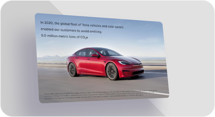In 2020, the global fleet of Tesla vehicles and solar panels enabled our customers to avoid emitting 5.0 million metric tons of CO e 2 The 3.5 million metric tons of vehicle CO2e savings estimate is based on the net CO2e savings during the use phase of a Tesla vehicle compared to an ICE vehicle with a real-world fuel economy of ~25 mpg. The 1.5 million metric tons of solar CO e savings estimate is based on CO e avoided through generation of zero-emission electricity from Tesla solar panels. 2 2 Distribution of our deliveries (both vehicle and solar), grid mix at the country, state and province level and upstream emissions are reflected in these figures. 5