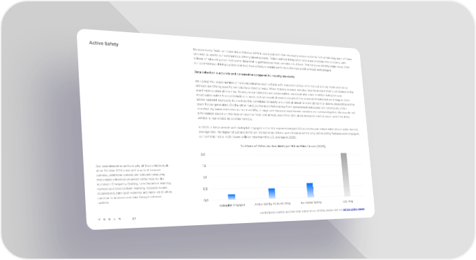 Active Safety Because every Tesla car made since October 2016 is equipped with the necessary sensor suite for full self-driving, each of these cars also supports our autonomous driving development. Tesla’s vertical integration and scale provides the company with billions of miles of global real-world data that is gathered as Tesla vehicles are driven. This helps us identify edge cases, train our autonomous driving system and test how a feature would perform in the real world without activating it. Data collection is accurate and conservative compared to industry standards We collect the exact number of miles traveled by each vehicle with Autopilot active or in manual driving mode and do so without identifying specific vehicles to protect privacy. When there is a crash, we also receive an alert that is correlated to the exact vehicle state at the time. To ensure our statistics are conservative, we count any crash in which Autopilot was deactivated within 5 seconds before a crash, and we count all crashes in which the crash alert indicated an airbag or other active restraint deployed. In practice, this correlates to nearly any crash at about 12 mph (20 kph) or above, depending on the crash forces generated. On the other hand, police-reported crashes from government databases are notoriously under- reported, by some estimates as much as 50%, in large part because most fender benders are not investigated. We also do not differentiate based on the type of crash or fault, and in fact, more than 35% of all Autopilot crashes occur when the Tesla vehicle is rear-ended by another vehicle. In 2020, a Tesla vehicle with Autopilot engaged in the U.S. experienced just 0.2 accidents per million miles driven while the U.S. average was ~9x higher at 2.0 accidents per million miles driven. Even in cases where only active safety features were engaged, our vehicles had a ~4.5x lower collision rate than the U.S. average in 2020. Numbers of Vehicular Accidents per Million Miles Driven (2020) 2,0 Our commitment to safety is why all Tesla vehicles built 1,5 since October 2016 come with a suite of external cameras, additional sensors and onboard computing that enable enhanced advanced safety features like 1,0 Automatic Emergency Braking, Lane Departure Warning, Forward and Side Collision Warning, Obstacle-Aware 0,5 Acceleration, blind spot warnings and more—all of which continue to improve over time through software updates. 0,0 Autopilot Engaged Active Safety Features Only No Active Safety U.S. Avg For the latest quarterly accident data related to our vehicles, please view our Vehicle Safety Report. 37