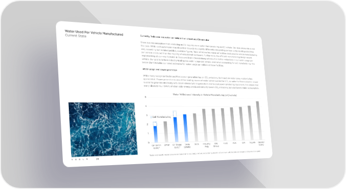 Water Used Per Vehicle Manufactured Currently, Tesla uses less water per vehicle than almost any ICE carmaker Current State There is a misconception that producing an EV requires more water than producing an ICE vehicle. Our data shows this is not the case. While each automaker may draw their boundaries slightly differently (depending on how vertically integrated they are), according to the latest publicly available figures, Tesla withdrew less water at facilities dedicated to vehicle manufacturing per vehicle produced than the majority of established carmakers. Furthermore, the efficient manufacturing design we are implementing at our new factories in Texas and Berlin-Brandenburg will result in further reductions in our water usage per vehicle. Our goal is to have industry-leading low water usage per vehicle, even when accounting for cell manufacturing. The below chart includes our latest estimates for water usage per vehicle at those facilities. Water usage and power generation While many recognize the impact that power generation has on CO emissions, its impact on water consumption is less 2 appreciated. Power generation is one of the leading causes of water withdrawal in the U.S., as water for thermoelectric power is used to generate electricity with steam-driven turbine generators and to cool power-producing equipment. This means that every kilowatt-hour (kWh) of clean solar energy produced not only lowers CO emissions, but also lowers water consumption. 2 3 Water Withdrawal Intensity in Vehicle Manufacturing (m /vehicle) 5 4 3 Cell Manufacturing 2 1 0 GF Berlin BMW GF Texas Tesla FCA Industry VW Ford PSA GM Toyota Daimler (est.)* (est.)* (2020) Avg. Group (cars) *Latest estimate for water consumption based on factory design. Actual production figures will not be known until factories are ramped to full production speed. 28
