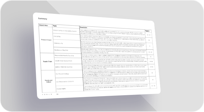 Summary Impact Area Topic Description Page(s) Tesla vehicles consistently achieve 5-star safety ratings in the U.S., Euro and Australasian NCAP programs. In 2020, Passive Safety & Tesla Safety Awards Model X and Model 3 both earned 5-stars across all three programs while Model Y earned 5-stars in the U.S. (it was not 38 - 39 yet available in Europe or Australia in 2020). From 2012 to 2020, there has been approximately one Tesla vehicle fire for every 205 million miles traveled. Data from Fire Safety the National Fire Protection Association (NFPA) and U.S. Department of Transportation show that in the U.S., there is 40 an average of one vehicle fire for every 19 million miles traveled. Product Impact In order to ensure we have the best products in the world, we continually update them with our industry-leading over- Cybersecurity the-air software updates, ensuring our customers always have the latest and greatest security and product features. 41 We also actively engage with academic experts and security experts to ensure the best of the best are pressure testing our systems. Electric grid disturbances in the U.S. have increased dramatically over the last 15 years. Our solar and storage products Resilience of the Grid not only deliver cost savings and energy independence, but they also harden the grid from adverse events in a cost- 42 - 43 effective and environmentally friendly manner. Responsible Material Sourcing While our complex supply chain is a unique hybrid of the traditional automotive and high-tech industries and 45 encompasses suppliers from around the world, Tesla is committed to only sourcing responsibly produced materials. Tesla has reduced cobalt content in our cathode substantially over the years; however, as long as cobalt is in our Supply Chain Cobalt in our Supply Chain supply chain, we are committed to fair and responsible sourcing that follows internationally accepted guidelines while 46-49 supporting the communities from which we source. Tesla continues to map our supply chain and prioritize the largest risks and opportunities. In 2020, lithium and nickel Battery Materials Sourcing became major themes given their contribution to greenhouse gas emissions, as well as environmental and human 50-53 rights challenges within the supply chain. Tesla's employees are its greatest asset and critical to achieving our mission. At the center of our People strategy is Our People Strategy regular and meaningful engagement with our employees, a robust culture of safety, clear development pathways for 55 all our employees, highly competitive compensation programs, and principles of diversity, equity and inclusion built into all aspects of hiring, promotion and retention. People and Tesla began preparing for COVID-19 in December 2019, well before it became a major theme in the U.S. We quickly Culture Our Response to COVID-19 updated policies, procedures and many of our business processes to ensure the health and safety of our employees 56 and customers. In 2020, Tesla had fewer than 40 workplace transmission cases of COVID-19 and our employee positivity rate was less than half the community rate. Tesla believes the ethical treatment of all people and regard for human rights is core to our mission of a sustainable Human Rights future and believe all businesses within our supply chain have a responsibility to support our mission and share our 57 - 58 respect for human rights. 82