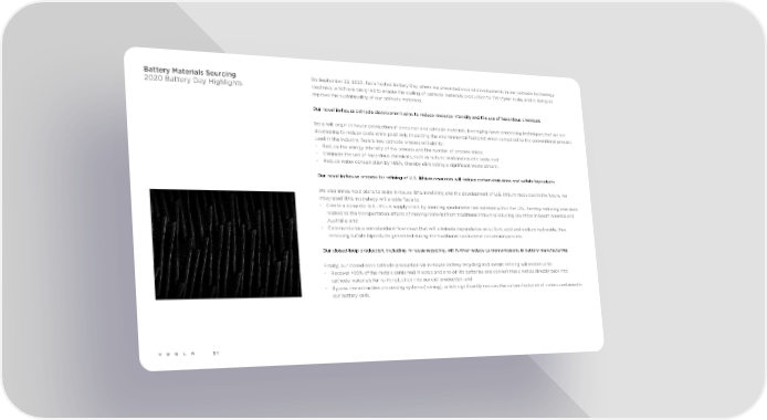 Battery Materials Sourcing On September 22, 2020, Tesla hosted Battery Day where we presented several developments in our cathode technology 2020 Battery Day Highlights roadmap, which are designed to enable the scaling of cathode materials production to TWh/year scale, and in doing so improve the sustainability of our cathode materials. Our novel in-house cathode development aims to reduce resource intensity and the use of hazardous chemicals Tesla will begin in-house production of precursor and cathode materials, leveraging novel processing techniques that we are developing to reduce costs while positively impacting the environmental footprint when compared to the conventional process used in the industry. Tesla’s new cathode process will aim to: • Reduce the energy intensity of the process and the number of process steps; • Eliminate the use of hazardous chemicals, such as sulfuric acid and caustic soda; and • Reduce water consumption by >95%, thereby eliminating a significant waste stream. Our novel in-house process for refining of U.S. lithium resources will reduce carbon emissions and sulfate biproducts We also announced plans to scale in-house lithium refining and the development of U.S. lithium resources in the future. An integrated lithium strategy will enable Tesla to: • Create a domestic U.S. lithium supply chain by sourcing spodumene raw material within the U.S., thereby reducing emissions related to the transportation efforts of moving material from traditional lithium-producing countries in South America and Australia; and • Commercialize a non-standard flow sheet that will eliminate dependence on sulfuric acid and sodium hydroxide, thus removing sulfate biproducts generated during the traditional spodumene conversion process. Our closed-loop production, including in-house recycling, will further reduce carbon emissions in battery manufacturing Finally, our closed-loop cathode production via in-house battery recycling and metals refining will enable us to: • Recover >99% of the metals contained in scrap and end-of-life batteries and convert these metals directly back into cathode materials for re-introduction into our cell production; and • Bypass the extractive processing systems (mining), which significantly reduces the carbon footprint of metals contained in our battery cells. 51