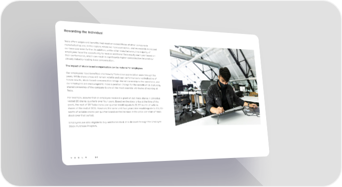 Rewarding the Individual Tesla offers wages and benefits that meet or exceed those of other comparable manufacturing jobs in the regions where we have a presence, and we recently increased our base pay even further. In addition, unlike other manufacturers, the majority of employees have the opportunity to receive additional Tesla equity each year based on their performance, which can result in significantly higher compensation beyond our already industry-leading base compensation. The impact of stock-based compensation can be material for employees Our employees have benefited enormously from value appreciation seen through the years. While share prices will remain volatile and past performance is not indicative of future results, stock-based compensation brings shared ownership to the workforce, and our employees are encouraged to make a positive change for the benefit of all. Culturally, shared ownership of the company is one of the most essential attributes of working at Tesla. For example, assume that an employee received a grant of 320 Tesla shares in 2018 that vested 20 shares quarterly over four years. Based on the stock price at the time of the grant, the vest of 20 Tesla shares per quarter would equate to $1,331-worth of sellable shares at the end of 2018. However, the same vest two years later would equate to $14,113- worth of sellable shares per quarter based on the increase in the price per share of Tesla stock over that period. Employees are also eligible to buy additional stock at a discount through the Employee Stock Purchase Program. 64