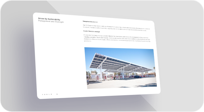Driven by Sustainability Management involvement Management and Oversight Our ESG Sustainability Council, made up of leaders from across Tesla, collects data and prepares the analysis and content of this report. The Sustainability Council also regularly presents this information to Tesla’s Board of Directors for review. Board of Directors oversight The Board of Directors serves as a prudent fiduciary for shareholders and oversees the management of Tesla’s business – including oversight of Tesla’s ESG impacts, initiatives and priorities. With those responsibilities in mind, the Board sets high standards for Tesla and its employees, officers and directors. Implicit in this approach is the importance of sound corporate governance. 9