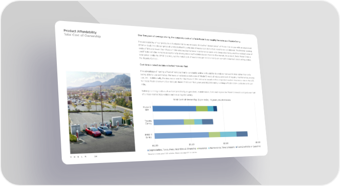 Product Affordability Over five years of average driving, the ownership costs of a Tesla Model 3 are roughly the same as a Toyota Camry Total Cost of Ownership The accessibility of our products is fundamental to our mission. While the “sticker price” of Model 3 is on-par with an equivalent BMW or Audi, the sticker price of a vehicle itself is only one of many cost items that need to be considered. The lifetime running costs of EVs are lower than those of ICE vehicles due to lower maintenance costs and cheap electricity, and the residual value of used Tesla vehicles remains exceptionally strong since we first introduced them to the market. As a result, Tesla Model 3 has a base price similar to BMW 3-series, but the total cost of ownership per mile is nearly on-par with America’s best-selling sedan, the Toyota Camry*. Cost data is based on data collected from our fleet The advantage of having a fleet of vehicles that is constantly online is the ability to analyze real-world data rather than only being able to use estimates. We have an extensive database of Model 3 residual values and cost of repairs, maintenance, energy use, etc. Additionally, the insurance cost for the Model 3 SR+ below is based on the projected median insurance rate in the U.S. for Tesla Model 3 drivers. Our analysis shows that over five years and 60,000 miles, running a Model 3 SR+ costs 55 cents per mile. Notably, running costs such as fuel (electricity or gasoline), maintenance, tires and repairs for Model 3 should cost just over half of a mass-market ICE vehicle such as a Toyota Camry. Total Cost of Ownership ($ per mile) - 5 years, 60,000 miles Model 3 SR+ Toyota Camry BMW 3 Series $0,00 $0,30 $0,60 $0,90 Depreciation, Taxes, Fees, Incentives & Financing Insurance Maintenance, Tires & Repairs Fuel (Electricity or Gasoline) *Based on model year 2020 vehicles. Please see page 92 for sources. 34