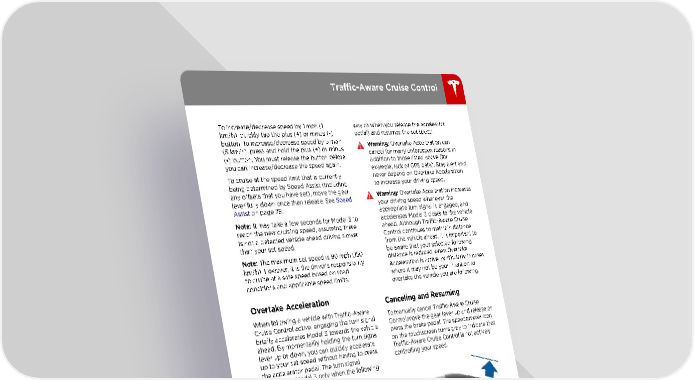 Traffic-Aware Cruise Control To increase/decrease speed by 1 mph (1 way as when you release the accelerator km/h), quickly tap the plus (+) or minus (-) pedal) and resumes the set speed. button. To increase/decrease speed by 5 mph Warning: Overtake Acceleration can (5 km/h), press and hold the plus (+) or minus cancel for many unforeseen reasons in (-) button. You must release the button before addition to those listed above (for you can increase/decrease the speed again. example, lack of GPS data). Stay alert and To cruise at the speed limit that is currently never depend on Overtake Acceleration being determined by Speed Assist (including to increase your driving speed. any offsets that you have set), move the gear Warning: Overtake Acceleration increases lever fully down once then release. See Speed your driving speed whenever the Assist on page 78. appropriate turn signal is engaged, and Note: It may take a few seconds for Model 3 to accelerates Model 3 closer to the vehicle reach the new cruising speed, assuming there ahead. Although Traffic-Aware Cruise is not a detected vehicle ahead driving slower Control continues to maintain distance than your set speed. from the vehicle ahead, it is important to Note: The maximum set speed is 90 mph (150 be aware that your selected following km/h). However, it is the driver's responsibility distance is reduced when Overtake to cruise at a safe speed based on road Acceleration is active, particularly in cases conditions and applicable speed limits. where it may not be your intention to overtake the vehicle you are following. Overtake Acceleration Canceling and Resuming When following a vehicle with Traffic-Aware To manually cancel Traffic-Aware Cruise Cruise Control active, engaging the turn signal Control,move the gear lever up and release or briefly accelerates Model 3 towards the vehicle press the brake pedal. The speedometer icon ahead. By momentarily holding the turn signal on the touchscreen turns gray to indicate that lever up or down, you can quickly accelerate Traffic-Aware Cruise Control is not actively up to your set speed without having to press controlling your speed. the accelerator pedal. The turn signal accelerates Model 3 only when the following conditions are met: • Traffic-Aware Cruise Control is operating and detects a vehicle in front of you. • No obstacles or vehicles are detected in the target lane. • Model 3 is traveling below the set speed, but over 45 mph (72 km/h). Overtake Acceleration is intended as an aid when passing a vehicle ahead of you. When the turn signal is engaged, Traffic-Aware Cruise Control continues to maintain distance from the vehicle ahead, but allows you to drive To re-enable cruising at the current driving slightly closer than your selected distance. speed, move the gear lever fully down once Acceleration cancels when: then release.. • You reach your set cruising speed. • Changing lanes takes too long. • Model 3 gets too close to the vehicle ahead. OR • You disengage the turn signal. Note: Overtake Acceleration occurs when you hold the turn signal in the momentary position (partially engaged). When you release the turn signal, Model 3 stops accelerating (in the same Driver Assistance 61