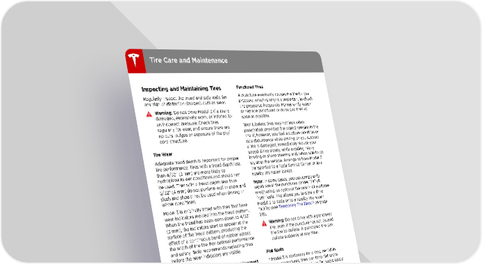 Tire Care and Maintenance Inspecting and Maintaining Tires Punctured Tires Regularly inspect the tread and side walls for A puncture eventually causes the tire to lose any sign of distortion (bulges), cuts or wear. pressure, which is why it is important to check Warning: Do not drive Model 3 if a tire is tire pressures frequently. Permanently repair or replace punctured or damaged tires as damaged, excessively worn, or inflated to soon as possible. an incorrect pressure. Check tires Your tubeless tires may not leak when regularly for wear, and ensure there are penetrated, provided the object remains in the no cuts, bulges or exposure of the ply/ tire. If, however, you feel a sudden vibration or cord structure. ride disturbance while driving, or you suspect Tire Wear a tire is damaged, immediately reduce your speed. Drive slowly, while avoiding heavy Adequate tread depth is important for proper braking or sharp steering and, when safe to do tire performance. Tires with a tread depth less so, stop the vehicle. Arrange to have Model 3 than 4/32” (3 mm) are more likely to transported to a Tesla Service Center, or to a hydroplane in wet conditions and should not nearby tire repair center. be used. Tires with a tread depth less than Note: In some cases, you can temporarily 5/32” (4 mm) do not perform well in snow and repair small tire punctures (under 1/4” (6 slush and should not be used when driving in mm)) using an optional tire repair kit available winter conditions. from Tesla. This allows you to slowly drive Model 3 is originally fitted with tires that have Model 3 to Tesla or to a nearby tire repair wear indicators molded into the tread pattern. facility (see Temporary Tire Repair on page When the tread has been worn down to 4/32” 118). (3 mm), the indicators start to appear at the Warning: Do not drive with a punctured surface of the tread pattern, producing the tire, even if the puncture has not caused effect of a continuous band of rubber across the tire to deflate. A punctured tire can the width of the tire. For optimal performance deflate suddenly at any time. and safety, Tesla recommends replacing tires before the wear indicators are visible. Flat Spots Tire Rotation, Balance, and Wheel Alignment If Model 3 is stationary for a long period in Tesla recommends rotating the tires every high temperatures, tires can form flat spots. 6250 miles (10,000 km). When Model 3 is driven, these flat spots cause a vibration which gradually disappears as the Unbalanced wheels (sometimes noticeable as tires warm up and regain their original shape. vibration through the steering wheel) affect To minimize flat spots during storage, inflate vehicle handling and tire life. Even with regular tires to the maximum pressure indicated on use, wheels can get out of balance. Therefore, the tire wall. Then, before driving, release air they should be balanced as required. to adjust tire pressure to the recommended If tire wear is uneven (on one side of the tire levels. only) or becomes abnormally excessive, check Improving Tire Mileage the alignment of wheels. Note: When replacing only two tires, always To improve the mileage you get from your install the new tires on the rear. tires, maintain tires at the recommended tire pressures, observe speed limits and advisory speeds, and avoid: • Pulling away quickly, or hard acceleration. • Fast turns and heavy braking. • Potholes and objects in the road. • Hitting curbs when parking. • Contaminating tires with fluids that can cause damage. 114 Model 3 Owner's Manual