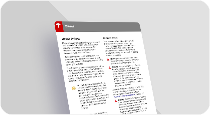 Brakes Braking Systems Emergency Braking Model 3 has an anti-lock braking system (ABS) In an emergency, fully press the brake pedal that prevents the wheels from locking when and maintain firm pressure, even on low you apply maximum brake pressure. This traction surfaces. The ABS varies the braking improves steering control during heavy pressure to each wheel according to the braking in most road conditions. amount of traction available. This prevents wheels from locking and ensures that you stop During emergency braking conditions, the as safely as possible. ABS constantly monitors the speed of each Warning: Do not pump the brake pedal. wheel and varies the brake pressure according Doing so interrupts operation of the ABS to the grip available. and can increase braking distance. The alteration of brake pressure can be felt as Warning: Always maintain a safe distance a pulsing sensation through the brake pedal. from the vehicle in front of you and be This demonstrates that the ABS is operating aware of hazardous driving conditions. and is not a cause for concern. Keep firm and While the ABS can improve stopping steady pressure on the brake pedal while distance, it cannot overcome the laws of experiencing the pulsing. physics. It also does not prevent the The ABS indicator flashes briefly on danger of hydroplaning (where a layer of the touchscreen when you first start water prevents direct contact between Model 3. If this indicator lights up at the tires and the road). any other time, an ABS fault has Automatic Emergency Braking automatically occurred and the ABS is not applies full braking in situations where a operating. Contact Tesla. The braking collision is considered imminent (see system remains fully operational and Automatic Emergency Braking on page 76). is not affected by an ABS failure. Warning: Automatic Emergency Braking However, braking distances may is not designed to prevent a collision. At increase. best, it can minimize the impact of a frontal collision by attempting to reduce If the touchscreen displays this your driving speed. Depending on indicator at any time other than Automatic Emergency Braking to avoid a displaying briefly when you first start collision can result in serious injury or Model 3, a brake system fault is death. detected or the brake fluid level is low. Contact Tesla immediately. Brake Wear Model 3 brake pads are equipped with wear indicators. A wear indicator is a thin metal strip attached to the brake pad that squeals as it rubs against the rotor when the pad wears down. This squealing sound indicates that the brake pads have reached the end of their service life and require replacement. To replace the brake pads, contact Tesla Service. Warning: Neglecting to replace worn brake pads results in damage to the braking system and can create a braking hazard. 46 Model 3 Owner's Manual