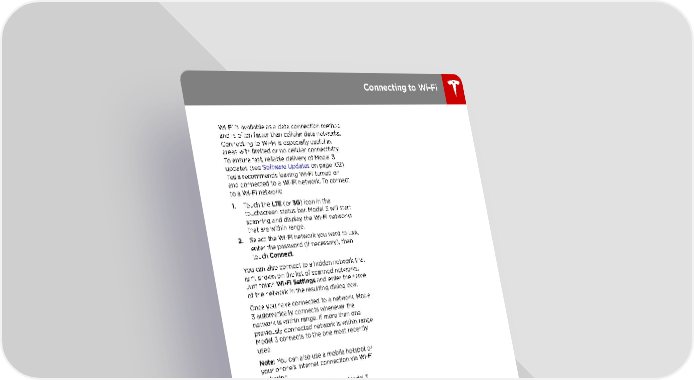 Connecting to Wi-Fi Wi-Fi is available as a data connection method and is often faster than cellular data networks. Connecting to Wi-Fi is especially useful in areas with limited or no cellular connectivity. To ensure fast, reliable delivery of Model 3 updates (see Software Updates on page 102), Tesla recommends leaving Wi-Fi turned on and connected to a Wi-Fi network. To connect to a Wi-Fi network: 1. Touch the LTE (or 3G) icon in the touchscreen status bar. Model 3 will start scanning and display the Wi-Fi networks that are within range. 2. Select the Wi-Fi network you want to use, enter the password (if necessary), then touch Connect. You can also connect to a hidden network that isn't shown on the list of scanned networks. Just touch Wi-Fi Settings and enter the name of the network in the resulting dialog box. Once you have connected to a network, Model 3 automatically connects whenever the network is within range. If more than one previously connected network is within range, Model 3 connects to the one most recently used. Note: You can also use a mobile hotspot or your phone's Internet connection via Wi-Fi tethering. Note: At Tesla Service Centers, Model 3 automatically connects to the Tesla Service Wi-Fi network. Using the Touchscreen 101