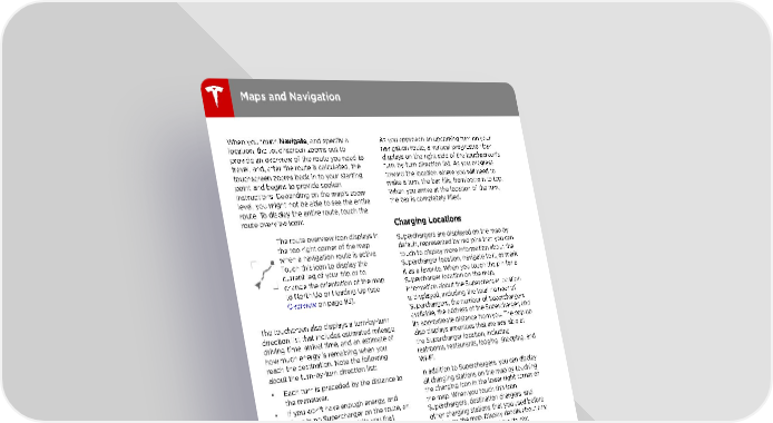 Maps and Navigation When you touch Navigate, and specify a As you approach an upcoming turn on your location, the touchscreen zooms out to navigation route, a vertical progression bar provide an overview of the route you need to displays on the right side of the touchscreen's travel, and, after the route is calculated, the turn-by-turn direction list. As you progress touchscreen zooms back in to your starting toward the location where you will need to point and begins to provide spoken make a turn, the bar fills, from bottom to top. instructions. Depending on the map†s zoom When you arrive at the location of the turn, level, you might not be able to see the entire the bar is completely filled. route. To display the entire route, touch the route overview icon: Charging Locations The route overview icon displays in Superchargers are displayed on the map by the top right corner of the map default, represented by red pins that you can when a navigation route is active. touch to display more information about the Touch this icon to display the Supercharger location, navigate to it, or mark current leg of your trip or to it as a favorite. When you touch the pin for a change the orientation of the map Supercharger location on the map, to North Up or Heading Up (see information about the Supercharger location Overview on page 93). is displayed, including the total number of Superchargers, the number of Superchargers The touchcreen also displays a turn-by-turn available, the address of the Supercharger, and direction list that includes estimated mileage, its approximate distance from you. The pop up driving time, arrival time, and an estimate of also displays amenities that are available at how much energy is remaining when you the Supercharger location, including reach the destination. Note the following restrooms, restaurants, lodging, shopping, and about the turn-by-turn direction list: Wi-Fi. • Each turn is preceded by the distance to In addition to Superchargers, you can display the maneuver. all charging stations on the map by touching • If you won't have enough energy, and the charging icon in the lower right corner of there is no Supercharger on the route, an the map. When you touch this icon, alert at the top of the tells you that Superchargers, destination chargers, and charging is required to reach your other charging stations that you used before destination. display on the map. Display details about any • If the energy remaining after a round-trip charging location by touching its pin: is less than ten percent, or if a round trip will consume a significant amount of The Supercharger location is battery energy, a round trip estimate of operational. the energy you will use displays at the bottom. You may need to scroll to the The Supercharger location may be bottom of the turn-by-turn directions to out of operation or is operating at see the round trip energy estimate. a reduced capacity. (Touch the pin Note: You can display a round trip energy to display details.) estimate for all trips (see Predicting The location is equipped with a Energy Usage on page 95). Tesla Wall Connector. Touch to • Touch the volume icon to change or mute display more information such as the volume of the spoken navigation available charge current and usage instructions. restrictions that may apply. Note: You can also change the volume of When a location is equipped with the navigation instructions by using the multiple charging stations, an icon scroll wheel on the left side of the steering displays the number of stations wheel while navigation directions are that are available. Zoom in to being spoken. display individual pins for each If charging is required to reach the destination station (described above). and Trip Planner is turned on, the navigation route includes Supercharger stops. See Trip Planner on page 95. 94 Model 3 Owner's Manual