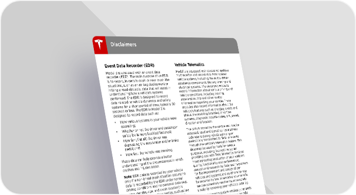 Disclaimers Event Data Recorder (EDR) Vehicle Telematics Model 3 is equipped with an event data Model 3 is equipped with electronic modules recorder (EDR). The main purpose of an EDR that monitor and record data from various is to record, in certain crash or near crash-like vehicle systems, including the motor, driver situations, such as an air bag deployment or assistance components, Battery, braking and hitting a road obstacle, data that will assist in electrical systems. The electronic modules understanding how a vehicle's systems record information about various driving and performed. The EDR is designed to record vehicle conditions, including braking, data related to vehicle dynamics and safety acceleration, trip and other related systems for a short period of time, typically 30 information regarding your vehicle. These seconds or less. The EDR in Model 3 is modules also record information about the designed to record data such as: vehicle†s features such as charging events and • How various systems in your vehicle were status, the enabling/disabling of various operating; systems, diagnostic trouble codes, VIN, speed, • Whether or not the driver and passenger direction and location. safety belts were buckled/fastened; The data is stored by the vehicle and may be • How far (if at all) the driver was accessed, used and stored by Tesla service depressing the accelerator and/or brake technicians during vehicle servicing or pedal; and, periodically transmitted to Tesla wirelessly • How fast the vehicle was traveling. through the vehicle†s telematics system. This data may be used by Tesla for various These data can help provide a better purposes, including, but not limited to: understanding of the circumstances in which providing you with Tesla telematics services; crashes and injuries occur. troubleshooting; evaluation of your vehicle†s Note: EDR data is recorded by your vehicle quality, functionality and performance; only if a non-trivial crash situation occurs; no analysis and research by Tesla and its partners data is recorded by the EDR under normal for the improvement and design of our driving conditions and no personal data (e.g., vehicles and systems; and as otherwise may name, gender, age, and crash location) is be required by law. In servicing your vehicle, recorded. However, other parties, such as law we can potentially resolve issues remotely enforcement, could combine the EDR data simply by reviewing your vehicle†s data log. with the type of personally identifying data Tesla†s telematics system wirelessly transmits routinely acquired during a crash vehicle information to Tesla on a periodic investigation. basis. The data is used as described above and To read data recorded by an EDR, special helps ensure the proper maintenance of your equipment is required, and access to the vehicle. Additional Model 3 features may use vehicle or the EDR is needed. In addition to your vehicle†s telematics system and the the vehicle manufacturer, other parties, such information provided, including features such as law enforcement, that have the special as charging reminders, software updates, and equipment, can read the information if they remote access to, and control of, various have access to the vehicle or the EDR. systems of your vehicle. Tesla does not disclose the data recorded in your vehicle to any third party except when: • An agreement or consent from the vehicle†s owner (or the leasing company for a leased vehicle) is obtained. • Officially requested by the police or other authorities. • Used as a defense for Tesla in a lawsuit. • Ordered by a court of law. • Used for research purposes without disclosing details of the vehicle owner or identification information. 150 Model 3 Owner's Manual