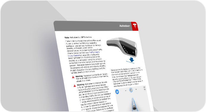 Autosteer Note: Autosteer is a BETA feature. If you have purchased the optional Enhanced Autopilot or Full Self-Driving Capability packages, you can use Autosteer to manage steering and speed under certain circumstances. Autosteer builds upon Traffic- Aware Cruise Control (see Traffic-Aware Cruise Control on page 58), intelligently keeping Model 3 in its driving lane when cruising at a set speed. Using the vehicle's camera(s), the radar sensor, and the ultrasonic sensors, Autosteer detects lane markings and the presence of vehicles and objects, steering Model 3 based on the lane markings and the vehicle directly in front of you. Autosteer briefly displays a message on the Warning: Autosteer is a hands-on feature. touchscreen reminding you to pay attention to You must keep your hands on the steering the road and be ready to take over at any wheel at all times. time. To indicate that Autosteer is now actively steering Model 3, the touchscreen Warning: Autosteer is intended for use displays the Autosteer icon in blue. When only on highways and limited-access Autosteer is able to detect lane markings, it roads with a fully attentive driver. When also displays the driving lane in blue. using Autosteer, hold the steering wheel and be mindful of road conditions and surrounding traffic. Do not use Autosteer on city streets, in construction zones, or in areas where bicyclists or pedestrians may be present. Never depend on Autosteer to determine an appropriate driving path. Always be prepared to take immediate action. Failure to follow these instructions could cause serious property damage, injury or death. Operating Autosteer Before you can operate Autosteer, you must enable it by touching Controls > Autopilot > Autosteer (Beta) > ON. To indicate that Autosteer is available (but not actively steering Model 3), the touchscreen Note: In situations where Autosteer is unable displays a gray Autosteer icon as shown here: to detect lane markings, the driving lane is determined based on the vehicle you are following. In these situations, the vehicle in front of you is highlighted in blue. Note: To initiate Autosteer when there is no vehicle in front of you, you must be driving at To initiate Autosteer, move the gear lever fully least 18 mph (30 km/h) on a roadway with down twice in quick succession. visible lane markings. If a vehicle is detected ahead of you, you can initiate Autosteer at any speed, even when stationary. Note: In most cases, Autosteer attempts to center Model 3 in the driving lane. However, if the sensors detect the presence of an obstacle (such as a vehicle or guard rail), Autosteer may steer Model 3 in a driving path that is offset from the center of the lane. Driver Assistance 63