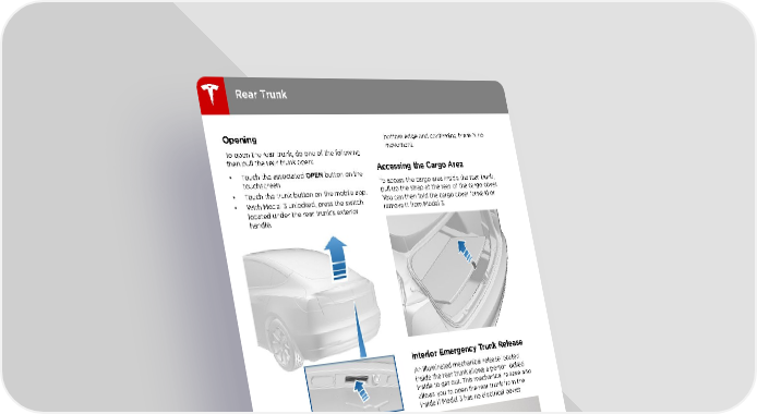 Rear Trunk bottom edge and confirming there is no Opening movement. To open the rear trunk, do one of the following then pull the rear trunk open: Accessing the Cargo Area • Touch the associated OPEN button on the touchscreen. To access the cargo area inside the rear trunk, • Touch the trunk button on the mobile app. pull up the strap at the rear of the cargo cover. • With Model 3 unlocked, press the switch You can then fold the cargo cover forward or located under the rear trunk's exterior remove it from Model 3. handle. Interior Emergency Trunk Release An illuminated mechanical release located inside the rear trunk allows a person locked inside to get out. This mechanical release also allows you to open the rear trunk from the inside if Model 3 has no electrical power. When a door or trunk is open, the touchscreen displays the Door Open indicator light. To open the trunk from inside Model 3 in the unlikely situation that Model 3 has no power, see Interior Emergency Trunk Release on page 12. Warning: Before opening or closing the rear trunk, it is important to check that the area around the trunk is free of obstacles (people and objects). 1. Firmly push the illuminated button in the direction of the arrow to release the latch. Closing 2. Push the rear trunk open. To close the rear trunk, push it downward until Note: The button glows for several hours after you hear the latch click into place. a brief exposure to ambient light. Note: Model 3 is equipped with pull cups to Warning: People should never climb assist with lowering the rear trunk. inside the trunk. Never lock a trunk when a person is inside. Warning: Before driving, ensure that the trunk is securely latched in the fully- closed position by lifting up on the 12 Model 3 Owner's Manual