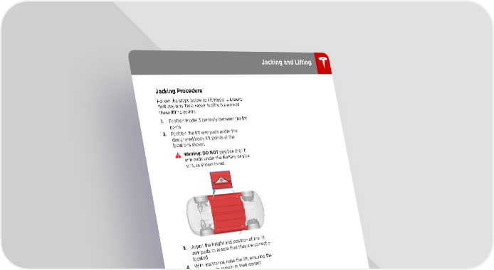 Jacking and Lifting Jacking Procedure Follow the steps below to lift Model 3. Ensure that any non-Tesla repair facility is aware of these lifting points. 1. Position Model 3 centrally between the lift posts. 2. Position the lift arm pads under the designated body lift points at the locations shown. Warning: DO NOT position the lift arm pads under the Battery or side rails, as shown in red. 3. Adjust the height and position of the lift arm pads to ensure that they are correctly located. 4. With assistance, raise the lift, ensuring the lift arm pads remain in their correct positions. Warning: Never raise Model 3 when the charge cable is connected, even if charging is not in progress. Warning: Do not work on an incorrectly supported vehicle. Doing so can cause serious damage, bodily injury, or death. Caution: DO NOT lift from under the Battery. Place the lift arm pads under the designated body lift points only. The locations shown are the only approved lifting points for Model 3. Lifting at any other points can cause damage. Damage caused by incorrectly lifting Model 3 is not covered by the warranty. Maintenance 129