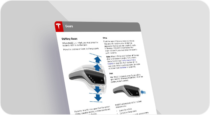Gears Drive Shifting Gears When Model 3 is in Park, you must press the Push the lever all the way down and release. brake to shift to another gear. You can shift into Drive when Model 3 is stopped or moving less than 5 mph (8 km/h) Move the lever up or down to change gears. in Reverse. If Model 3 is moving less than 1 mph (1.6 km/h), you must press the brake to shift into Drive. Note: When in Drive, push the lever all the way down and release to enable Traffic-Aware Cruise Control (see Traffic-Aware Cruise Control on page 58). Push the lever all the way down twice in quick succession to enable Autosteer (see Autosteer on page 63). Park With Model 3 stopped, press the end of the gear selector. Whenever Model 3 is in Park, the parking brake is applied. If you try to shift into a gear that the current Model 3 automatically shifts into Park driving speed prohibits, a chime sounds and whenever you: the gear does not change. • Leave the vehicle. • Connect a charge cable. Reverse To make it convenient to pick up passengers, Push the lever all the way up and release. You you can also unlock all doors at any time by can only shift into Reverse when Model 3 is shifting into Park then pressing the Park stopped or moving less than 5 mph (8 km/h). button a second time. If moving less than 1 mph (1.6 km/h), you must press the brake. Neutral Push the lever up or down to the first position and release to shift into Neutral. Neutral allows Model 3 to roll freely. If Model 3 is in Park and you use the touchscreen to release the parking brake (Controls > Safety & Security), Model 3 shifts into Neutral (see Parking Brake on page 47). Model 3 automatically shifts into Park when you exit. 38 Model 3 Owner's Manual