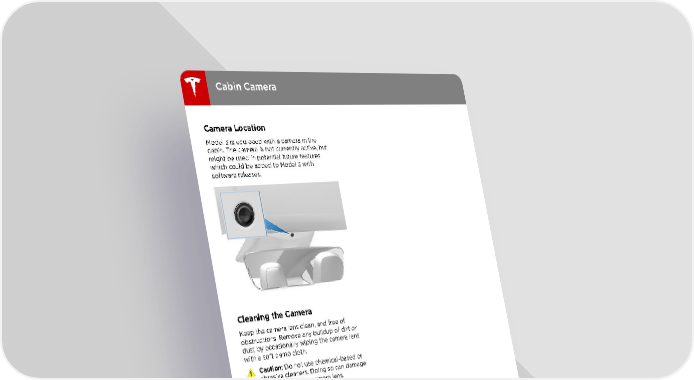 Cabin Camera Camera Location Model 3 is equipped with a camera in the cabin. The camera is not currently active, but might be used in potential future features which could be added to Model 3 with software releases. Cleaning the Camera Keep the camera lens clean, and free of obstructions. Remove any buildup of dirt or dust by occasionally wiping the camera lens with a soft damp cloth. Caution: Do not use chemical-based or abrasive cleaners. Doing so can damage the surface of the camera lens. 54 Model 3 Owner's Manual
