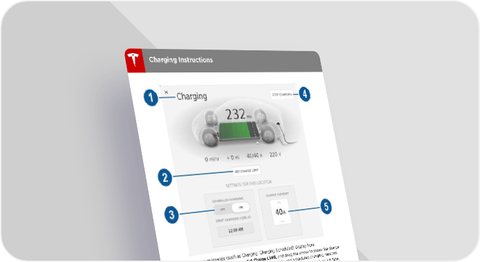 Charging Instructions 1. Charge status messages (such as Charging, Charging Scheduled) display here. 2. Adjust the charge limit by touching Set Charge Limit, and drag the arrow to move the charge limit setting. The setting you choose applies to immediate and scheduled charging sessions. 3. Set a recurring charging schedule for the location. When you set a scheduled charging time, Model 3 displays the set time when you are parked at the scheduled location. If, at the scheduled time, Model 3 is not plugged in at the location, charging starts as soon as you plug it in, provided you plug it in within six hours of the scheduled time. If plugged in after six hours, charging does not start until the scheduled time on the next day. To override this setting, touch Start Charging or Stop Charging (see next item in this list). 4. Touch to open the charge port door or to start (or stop) charging. 5. The current automatically sets to the maximum current available from the attached charge cable, unless it was previously reduced to a lower level. If needed, touch the up/down arrows to change the current (for example, you may want to reduce the current if you are concerned about overloading a domestic wiring circuit shared by other equipment). It is not possible to set the charging current to a level that exceeds the maximum available from the attached charge cable. When you change the current, Model 3 remembers the location. If you charge at the same location, you do not need to change it again. Note: If Model 3 is charging and detects unexpected fluctuations in input power, the charging current is automatically reduced by 25%. For example, a 40 amp current is reduced to 30 amps. This automatic current reduction increases robustness and safety in situations when an external problem exists (for example, a home wiring system, receptacle, adapter or cord is unable to meet its rated current capacity). As a precaution, when Model 3 automatically reduces current, it saves the reduced current at the charging location. Although you can manually increase it, Tesla recommends charging at the lower current until the underlying problem is resolved and the charging location can provide consistent power. 110 Model 3 Owner's Manual