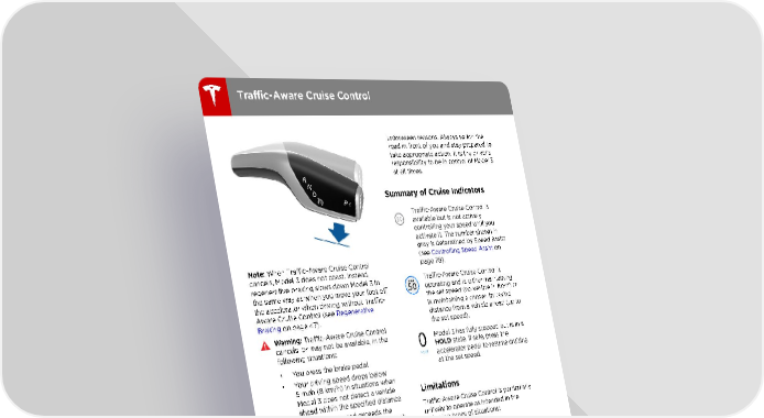 Traffic-Aware Cruise Control unforeseen reasons. Always watch the road in front of you and stay prepared to take appropriate action. It is the driver's responsibility to be in control of Model 3 at all times. Summary of Cruise Indicators Traffic-Aware Cruise Control is available but is not actively controlling your speed until you activate it. The number shown in gray is determined by Speed Assist (see Controlling Speed Assist on Note: When Traffic-Aware Cruise Control page 78). cancels, Model 3 does not coast. Instead, Traffic-Aware Cruise Control is regenerative braking slows down Model 3 in operating and is either maintaining the same way as when you move your foot off the set speed (no vehicle in front) or the accelerator when driving without Traffic- is maintaining a chosen following Aware Cruise Control (see Regenerative distance from a vehicle ahead (up to Braking on page 47). the set speed). Warning: Traffic-Aware Cruise Control cancels, or may not be available, in the Model 3 has fully stopped but is in a following situations: HOLD state. If safe, press the • You press the brake pedal. accelerator pedal to resume cruising • Your driving speed drops below at the set speed. 5 mph (8 km/h) in situations when Model 3 does not detect a vehicle Limitations ahead within the specified distance. • Your driving speed exceeds the Traffic-Aware Cruise Control is particularly maximum cruising speed of 90 mph unlikely to operate as intended in the (150 km/h). following types of situations: • You shift Model 3 into a different • The road has sharp curves. gear. • Visibility is poor (due to heavy rain, snow, • The driver's seat belt is unbuckled. fog, etc.). • A door is opened. • Bright light (such as from oncoming • The view from the radar sensor or headlights or direct sunlight) is interfering camera(s) is obstructed. This could with the view of the camera(s). be caused by dirt, mud, ice, snow, fog, • The radar sensor is obstructed (dirty, etc. covered, etc.). • The traction control setting is • The windshield is obstructing the view of manually disabled or is repeatedly the camera(s) (fogged over, dirty, covered engaging to prevent wheels from by a sticker, etc.). slipping. Warning: The list above does not • The wheels are spinning while at a represent an exhaustive list of situations standstill. that may interfere with proper operation • The Traffic-Aware Cruise Control of Traffic-Aware Cruise Control. system is failing or requires service. When Traffic-Aware Cruise Control is unavailable or cancels, Model 3 no longer drives consistently at a set speed and no longer maintains a specified distance from the vehicle ahead. Warning: Traffic-Aware Cruise Control can cancel unexpectedly at any time for 62 Model 3 Owner's Manual