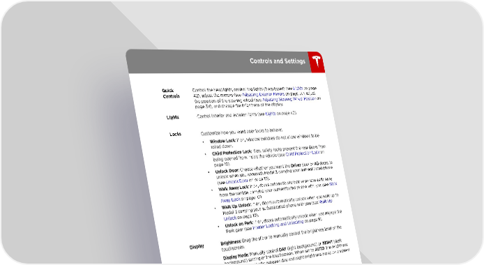 Controls and Settings Quick Control the headlights, control fog lights (if equipped) (see Lights on page Controls 42), adjust the mirrors (see Adjusting Exterior Mirrors on page 36), adjust the position of the steering wheel (see Adjusting Steering Wheel Position on page 34), and change the brightness of the display. Lights Control interior and exterior lights (see Lights on page 42). Locks Customize how you want door locks to behave: • Window Lock: If on, window switches do not allow windows to be rolled down. • Child Protection Lock: If on, safety locks prevent the rear doors from being opened from inside the vehicle (see Child Protection Lock on page 10). • Unlock Door: Choose whether you want the Driver door or All doors to unlock when you approach Model 3 carrying your authenticated phone (see Unlock Door on page 10). • Walk Away Lock: If on, doors automatically lock when you walk away from the vehicle, carrying your authenticated phone with you (see Walk Away Lock on page 10). • Walk Up Unlock: If on, doors automatically unlock when you walk up to Model 3 carrying your authenticated phone with you (see Walk Up Unlock on page 10). • Unlock on Park: If on, doors automatically unlock when you engage the Park gear (see Interior Locking and Unlocking on page 9). Display Brightness: Drag the slider to manually control the brightness level of the touchscreen. Display Mode: Manually control DAY (light background) or NIGHT (dark background) setting of the touchscreen. When set to AUTO, the brightness changes automatically between day and night brightness based on ambient lighting conditions. Touch Settings to customize the following: • Language: Set the language the touchscreen uses to display information. • Navigation Language (if available):Set the language used when Model 3 speaks navigation instructions. • Region Format (if available): Choose a region to define the formatting convention used to display dates (mm dd yy/dd-mm-yy, etc) and decimal separators (5.123, 5,123, etc). • Distance: Choose if miles or km are shown on the range display, speedometer, energy chart, trip meters, map searches and navigation routes. • Time Format: Choose if time is displayed in 12 or 24 hour format. • Temperature: Choose if temperature is displayed in °C or °F. • Screen Clean Mode: Disable the touchscreen momentarily for cleaning purposes. Note: Model 3 must be in Park to change the language. When you change the language, you experience a brief delay as the vehicle shuts down and restarts the touchscreen. Using the Touchscreen 81