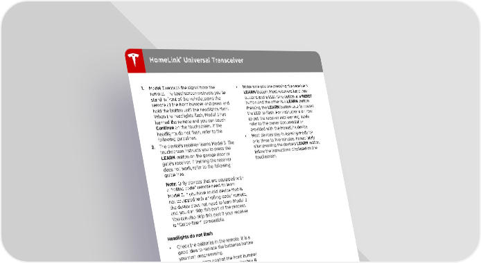® HomeLink Universal Transceiver 1. Model 3 records the signal from the • Make sure you are pressing the receiver's remote. The touchscreen instructs you to LEARN button. Most receivers have two stand in front of the vehicle, point the buttons and a LED. One button is a RESET remote at the front bumper and press and button and the other is a LEARN button. hold the button until the headlights flash. Pressing the LEARN button usually causes When the headlights flash, Model 3 has the LED to flash. For instructions on how learned the remote and you can touch to put the receiver into learning mode, Continue on the touchscreen. If the refer to the owner documentation headlights do not flash, refer to the provided with the HomeLink device. following guidelines. • Most devices stay in learning mode for 2. The device's receiver learns Model 3. The only three to five minutes. Immediately touchscreen instructs you to press the after pressing the device's LEARN button, LEARN button on the garage door or follow the instructions displayed on the gate's receiver. If training the receiver touchscreen. does not work, refer to the following guidelines. Note: Only devices that are equipped with a “rolling code” remote need to learn Model 3. If you have an old device that is not equipped with a "rolling code" remote, the device does not need to learn Model 3 and you can skip this part of the process. You can also skip this part if your receiver is "Quick-Train" compatible. Headlights do not flash • Check the batteries in the remote. It is a good idea to replace the batteries before you start programming. • Hold the remote against the front bumper, with the button pressed, approximately 6 in (15 cm) to the left of the Tesla emblem. In some cases you must hold the button on the remote for up to three minutes. • Check compatibility of the remote by contacting the HomeLink manufacturer (www.homelink.com). After programming, the device does not work • Park Model 3 with its front bumper as close as possible to the HomeLink device (garage door, gate, etc). • Make sure you haven†t reached the device receiver's limit of learned remotes/cars. Most receivers can learn up to five remotes/cars. If the receiver's memory is full, you must clear the memory and restart the programming process. For instructions on how to clear the receiver's memory, refer to the owner documentation provided with the HomeLink device. 100 Model 3 Owner's Manual