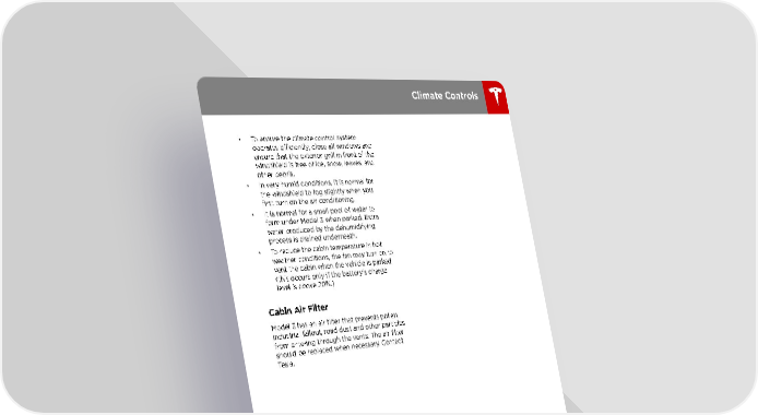 Climate Controls • To ensure the climate control system operates efficiently, close all windows and ensure that the exterior grill in front of the windshield is free of ice, snow, leaves, and other debris. • In very humid conditions, it is normal for the windshield to fog slightly when you first turn on the air conditioning. • It is normal for a small pool of water to form under Model 3 when parked. Extra water produced by the dehumidifying process is drained underneath. • To reduce the cabin temperature in hot weather conditions, the fan may turn on to vent the cabin when the vehicle is parked (this occurs only if the battery's charge level is above 20%.) Cabin Air Filter Model 3 has an air filter that prevents pollen, industrial fallout, road dust and other particles from entering through the vents. The air filter should be replaced when necessary. Contact Tesla. Using the Touchscreen 87