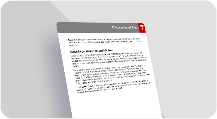 Charging Instructions Note: If charging at a Tesla Supercharger, the charging screen also displays information about your previous or current Supercharger session (see Supercharger Usage Fees and Idle Fees on page 111). Supercharger Usage Fees and Idle Fees When charging using a Tesla supercharger, PAID SUPERCHARGING information displays at the bottom of the charging screen. This information includes the location, the time that charging started, and an estimate of how much the session will cost. When you stop charging, the final cost displays until a new Supercharging session begins. If free charging is applicable, the cost displays as zero. Regardless of whether or not you are eligible for free charging, you are subject to idle fees. Idle fees are designed to encourage drivers to move their vehicle from the Supercharger when charging is complete and are in effect whenever at least half of the Superchargers at a site are occupied. The Tesla mobile app notifies you when charging nears completion, and again when charging is complete. Additional notifications are sent if idle fees are incurred. Idle fees are waived if you move your vehicle within five minutes. Log into MY TESLA to view fees and details about Supercharger sessions, track the remaining balance of free credits, set up a payment method, and make payments. Once a payment method is saved, fees are automatically paid from your account. Charging 111