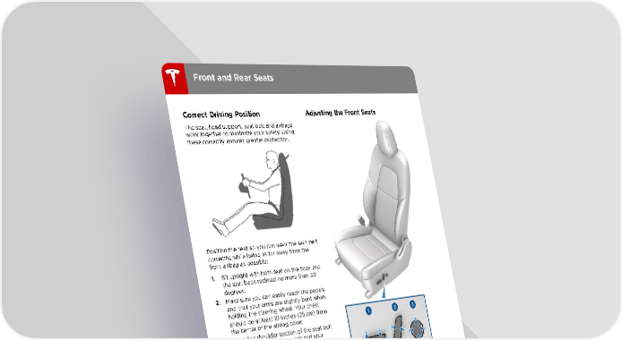 Front and Rear Seats Correct Driving Position Adjusting the Front Seats The seat, head support, seat belt and airbags work together to maximize your safety. Using these correctly ensures greater protection. Position the seat so you can wear the seat belt correctly, while being as far away from the front airbag as possible: 1. Sit upright with both feet on the floor and the seat back reclined no more than 30 degrees. 2. Make sure you can easily reach the pedals and that your arms are slightly bent when holding the steering wheel. Your chest should be at least 10 inches (25 cm) from the center of the airbag cover. 3. Place the shoulder section of the seat belt mid-way between your neck and your shoulder. Fit the lap section of the belt tightly across your hips, not across your stomach. Model 3 seats include integrated head supports that cannot be adjusted or removed. 1. Move seat forward/backward and adjust the seat†s height and tilt angle up/down. 2. Adjust backrest. 3. Adjust lumbar support. Warning: Do not adjust seats while driving. Doing so increases the risk of a collision. Warning: Riding in a moving vehicle with the seat back reclined can result in serious injuries in a collision, as you could slide under the lap belt or be propelled into the seat belt. Ensure your seat back is reclined no more than 30 degrees when the vehicle is moving. 18 Model 3 Owner's Manual