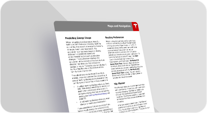 Maps and Navigation Predicting Energy Usage Routing Preferences When navigating to a destination, Model 3 Model 3 detects real-time traffic conditions helps you anticipate your charging needs by and can automatically adjust the estimated calculating the amount of energy that remains driving and arrival times based on traffic. In when you reach your destination. The situations where traffic conditions will delay calculation is an estimate based on driving your estimated time of arrival, and an style such as predicted speed and alternate route is available, the navigation environmental factors such as elevation system can reroute you to your destination. To changes. The touchscreen displays this turn this feature on and off, touch the Gear calculation at the bottom of the turn-by-turn icon in the bottom right area of the direction list when you first initiate the touchscreen, and then touch Re-Route If It navigation route. Thereafter, you can display it Saves More Than. You can also specify the by touching the area at the bottom of the minimum amount of minutes that must be turn-by-turn direction list. saved before you are rerouted by touching the Throughout your route, Model 3 monitors arrows associated with the Re-Route If It energy usage and updates the calculation. A Saves More Than setting. You can specify popup warning displays at the bottom of the from one to thirty minutes as the number of turn-by-turn direction list in these situations: minutes that must be saved. • A yellow warning displays when you have Trip Planner very little energy remaining to reach your destination and should drive slowly to Trip Planner helps you take longer road trips conserve energy. For tips on conserving with confidence. If reaching your destination energy, see Getting Maximum Range on requires charging, Trip Planner routes you page 52. through the appropriate Supercharger • A red warning displays when you must locations. Trip Planner selects a route that charge to reach your destination. minimizes the time you spend driving and If you want Model 3 to let you know if you charging. have enough energy for a round trip by After you select a destination, Trip Planner displaying a round trip energy calculation at zooms out to give you an overview of your the bottom of the turn-by-turn direction list, trip. As you begin your trip, Trip Planner touch the Gear icon in the bottom right area zooms in to start navigation. The turn-by-turn of the touchscreen, and then touch Always direction list includes: Show Estimated Round Trip Energy. If this • Supercharger stops (Trip Planner does not setting is not enabled, an estimate of your consider charging locations that are not round trip energy usage displays at the Superchargers). bottom of the turn-by-turn direction list only if • Charging time required at each the energy remaining after completion of the Supercharger. round trip is estimated at less than ten percent, or if the round trip consumes a • Estimated amount of energy available significant amount of your available energy. when you arrive at the first Supercharger. While charging at a Supercharger stop, the charging screen displays the remaining charge time needed for your trip. If you charge for a shorter or longer length of time, the charge time for subsequent stops are readjusted. Note: You can scroll down the list (or zoom out on the map) to see the next Supercharger location on your trip. Note: If a Supercharger located on your existing route experiences an outage, Trip Planner displays a notification and reroutes you to a different Supercharger location. Using the Touchscreen 95