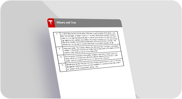 Wheels and Tires 11 U.S. DOT Tire Identification Number (TIN). Begins with the letters DOT and indicates that the tire meets all federal standards. The next 2 digits/letters represent the plant code where it was manufactured, and the last 4 digits represent the week and year of manufacture. For example, the number 1712 is used to represent the 17th week of 2012. The other numbers are marketing codes used at the manufacturer†s discretion. This information can be used to contact consumers if a tire defect requires a recall. 12 Treadwear grade. This number indicates the tire†s wear rate. The higher the treadwear number is, the longer it should take for the tread to wear down. A tire rated at 400, for example, lasts twice as long as a tire rated at 200. 13 Traction grade. Indicates a tire†s ability to stop on wet roads. A higher graded tire should allow you to stop your vehicle in a shorter distance than a tire with a lower grade. Traction is graded from highest to lowest as AA, A, B, and C. 14 Temperature grade. The tire†s resistance to heat is grade A, B, or C, with A indicating the greatest resistance. This grading is provided for a correctly inflated tire, which is being used within its speed and loading limits. 140 Model 3 Owner's Manual