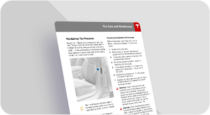 Tire Care and Maintenance Maintaining Tire Pressures Checking and Adjusting Tire Pressures Keep tires inflated to the pressures shown on Follow these steps when tires are cold and the Tire and Loading Information label, even if Model 3 has been stationary for over three it differs from the pressure printed on the tire hours: itself. The Tire and Loading Information label is 1. Remove the valve cap. located on the center door pillar and is visible 2. Firmly press an accurate tire pressure when the driver†s door is open. gauge onto the valve to measure pressure. 3. If required, add or remove air to reach the recommended pressure. 4. Re-check pressure by removing and re- attaching the tire gauge. 5. If you added too much air, release air by pressing the metal stem in the center of the valve. 6. Recheck the pressure with the tire gauge and adjust if necessary. 7. Replace the valve cap to prevent dirt from entering. Periodically check the valve for damage and leaks. Warning: Under-inflation is the most common cause of tire failures and can cause a tire to overheat, resulting in severe tire cracking, tread separation, or blowout, which causes unexpected loss of The Tire Pressure indicator light on vehicle control and increased risk of the touchscreen alerts you if one or injury. Under-inflation also reduces the more tires is under- or over-inflated. vehicle's range and tire tread life. Warning: Check tire pressures using an The Tire Pressure indicator light does not accurate pressure gauge when tires are immediately turn off when you adjust tire cold. It takes only about one mile (1.6 km) pressure. After inflating the tire to the of driving to warm up the tires sufficiently recommended pressure, you must drive over to affect tire pressures. Parking the 15 mph (25 km/h) for more than 10 minutes to vehicle in direct sunlight or in hot weather activate the Tire Pressure Monitoring System can also affect tire pressures. If you must (TPMS), which turns off the Tire Pressure check warm tires, expect increased indicator light. pressures. Do not let air out of warm tires If the indicator light flashes for one minute in an attempt to match recommended whenever you power on Model 3, a fault with cold tire pressures. A hot tire at or below the Tire Pressure Monitoring System (TPMS) is the recommended cold tire inflation detected (see TPMS Malfunction on page pressure is dangerously under-inflated. 117). Warning: Do not use any tire sealant other than the type provided in a Tesla tire repair kit. Other types can cause tire pressure sensors to malfunction. If your Model 3 did not include a tire repair kit, you can purchase one from Tesla. Maintenance 113
