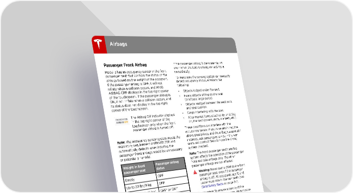 Airbags Passenger Front Airbag If the passenger airbag is permanently off, even when the seat is empty, contact Tesla Model 3 has an occupancy sensor in the front immediately. passenger seat that controls the status of the To make sure the sensing system can correctly airbags based on the weight of the occupant. detect occupancy status, eliminate the If the passenger airbag is OFF, it will not following: inflate when a collision occurs, and PASS AIRBAG OFF displays in the top right corner • Objects lodged under the seat. of the touchscreen. If the passenger airbag is • Heavy objects sitting on the seat ON, it will inflate when a collision occurs, and (briefcase, large purse). its status does not display in the top right • Objects wedged between the seat back corner of the touchscreen. and seat cushion. The Airbag Off indicator displays • Cargo interfering with the seat. in the top right corner of the • After market items attached to, or sitting touchscreen only when the front on, the seat (covers, mats, blankets, etc.). passenger airbag is turned off. These conditions can interfere with the occupancy sensor. If you have eliminated the Note: The occupancy sensor system meets the above possibilities, and the airbag status is still regulatory requirement of FMVSS 208 and incorrect, ask passengers to ride in the rear automatically detects when inflating the seats and contact Tesla to have the airbag passenger front airbags would be unnecessary system checked. or potentially harmful. Note: The front passenger seat†s sensing Weight in front Passenger airbag system affects the operation of the passenger passenger seat status front and side airbags only. The other passenger airbags are not affected. Empty OFF Warning: Never seat a child on the front Up to 20 lbs/9 kg OFF passenger seat, even if the passenger airbag is off. All occupants age 12 and 20-100 lbs/9-45 kg* OFF* or ON** under must ride in the rear seats (see Child Safety Seats on page 24). Over 100 lbs/45 kg ON** Warning: To ensure accuracy of the *Values are approximate. A weight detected occupant detection system, do not make near the threshold can cause the airbag any modifications to the front passenger status to occasionally turn on and off seat. depending on seating position and Warning: Do not use seat covers on physique. Model 3. Doing so could restrict **The absence of the status, PASS AIRBAG deployment of the seat-mounted side air OFF, in the top right corner of the bags if a collision occurs. It can also touchscreen indicates that the passenger reduce the accuracy of the occupant airbag is ON and will inflate in the event of a detection system, if equipped. collision. Inflation Effects Note: It takes approximately six seconds after Warning: When airbags inflate, a fine you power on Model 3 for the occupancy powder is released. This powder can sensor to report accurate status of the front irritate the skin and should be thoroughly passenger airbag. As a result, when you first flushed from the eyes and from any cuts power on Model 3, even in situations when it or abrasions. should be OFF because the passenger seat is After inflation, the airbags deflate to provide a either empty or carrying a weight of 20 lbs (9 gradual cushioning effect for the occupants kg) or less, the touchscreen can take up to six and to ensure the driver†s forward vision is not seconds to display the status, PASS AIRBAG obscured. OFF. If it fails to do so, contact Tesla service immediately and seat passengers in the rear seating positions only. 32 Model 3 Owner's Manual