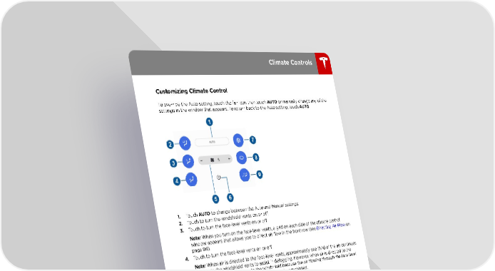 Climate Controls Customizing Climate Control To override the Auto setting, touch the fan icon then touch AUTO or manually change any of the settings in the window that appears. To return back to the Auto setting, touch AUTO. 1. Touch AUTO to change between the Auto and Manual settings. 2. Touch to turn the windshield vents on or off. 3. Touch to turn the face-level vents on or off. Note: When you turn on the face-level vents, a grid on each side of the climate control window appears that allows you to direct air flow in the front row (see Directing Air Flow on page 86). 4. Touch to turn the foot-level vents on or off. Note: When air is directed to the foot-level vents, approximately one third of the air continues to flow to the windshield vents to assist in defogging. However, when air is directed to the face-level vents, no air flows to the windshield because the air flowing through the face-level vents may be adequate to assist in defogging the windshield. 5. Touch + or - to increase or decrease the speed of the fan. Note: Adjusting the fan speed may change the selected setting for how air is drawn into Model 3 in order to increase or reduce air flow. If you set the fan speed very high (for example, setting 10), Model 3 may automatically switch from drawing in outside air to recirculating air to achieve the high air flow. 6. Touch to turn the climate control system on or off. 7. Touch to turn the A/C on or off. Turning it off reduces cooling, but saves energy. Note: Because Model 3 runs much quieter than a gasoline-powered vehicle, you may notice the sound of the compressor as it is operating. To minimize noise, reduce the fan speed. 8. Touch to choose how air is drawn into Model 3. If on, air inside Model 3 is recirculated. If off, outside air is drawn into Model 3. 9. A vent is located at the back of the center console. Touch to direct turn air flow to the rear cabin area on or off. Using the Touchscreen 85