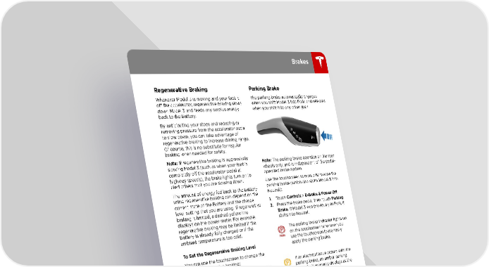 Brakes Regenerative Braking Parking Brake Whenever Model 3 is moving and your foot is The parking brake automatically engages off the accelerator, regenerative braking slows when you shift Model 3 into Park, and releases down Model 3 and feeds any surplus energy when you shift into any other gear. back to the Battery. By anticipating your stops and reducing or removing pressure from the accelerator pedal to slow down, you can take advantage of regenerative braking to increase driving range. Of course, this is no substitute for regular braking when needed for safety. Note: If regenerative braking is aggressively Note: The parking brake operates on the rear slowing Model 3 (such as when your foot is wheels only, and is independent of the pedal- completely off the accelerator pedal at operated brake system. highway speeds), the brake lights turn on to alert others that you are slowing down. Use the touchscreen to manually release the The amount of energy fed back to the Battery parking brake (which also shifts Model 3 into using regenerative braking can depend on the Neutral): current state of the Battery and the charge 1. Touch Controls > E-Brake & Power Off. level setting that you are using. If regenerative 2. Press the brake pedal, then touch Parking braking is limited, a dashed yellow line Brake. If Model 3 was previously in Park, it displays on the power meter. For example, shifts into Neutral. regenerative braking may be limited if the Battery is already fully charged or if the The parking brake indicator lights up ambient temperature is too cold. on the touchscreen whenever you use the touchscreen to manually To Set the Regenerative Braking Level apply the parking brake. You can use the touchscreen to change the level of regenerative braking: If an electrical issue occurs with the 1. Touch Controls > Driving > Regenerative parking brake, an amber parking Braking. brake fault message displays at the 2. Choose from two levels: top of the touchscreen. • Standard - Provides the standard amount of regenerative braking. When Caution: In the unlikely event that Model you release the accelerator, Model 3 3 loses electrical power, you cannot slows down, reducing the need to use release the parking brake. Contact Tesla. the brakes. • Low - Limits regenerative braking. When you release the accelerator, Model 3 takes longer to slow down and coasts further than if set to Standard. Driving 47