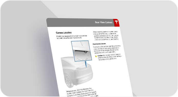Rear View Camera Camera Location When reversing, perform shoulder checks and use all mirrors. Use the camera for Model 3 is equipped with a rear view camera guidance purposes only. It is not intended located above the rear license plate. to replace your own direct visual checks and is not a substitute for careful driving. Cleaning the Camera To ensure a clear picture, keep the camera lens clean, and free of obstructions. Remove any buildup of dirt by occasionally wiping the camera lens with a soft damp cloth. Caution: Do not use chemical-based or abrasive cleaners. Doing so can damage the surface of the camera lens. Whenever you shift into Reverse, the touchscreen displays the view from the camera. Guide lines show your driving path based on the position of the steering wheel. These guide lines adjust appropriately as you move the steering wheel. Note: Visual feedback from the parking sensors displays on the touchscreen (see Park Assist on page 49). To display the view from the camera any time, touch the camera icon on the left side of the touchscreen. Warning: Never depend on the rear view camera to inform you if the area behind you is free of objects and/or people when reversing. The camera may not detect objects or barriers that can potentially cause damage or injury. In addition, several external factors can reduce the performance of the camera, including a dirty or obstructed lens. Therefore, depending on the rear view camera to determine if Model 3 is approaching an obstruction can result in damage to the vehicle and/or objects, and can potentially cause serious injury. Always inspect the area with your own eyes. Driving 53