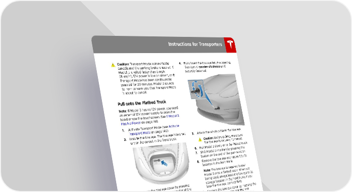 Instructions for Transporters Caution: Transport Mode automatically 4. Fully insert the tow eye into the opening, cancels and the parking brake is applied if then turn it counter-clockwise until Model 3 is rolled faster than 5 mph securely fastened. (8 km/h), 12V power is low or absent, or if Transport Mode has been continuously enabled for 20 minutes. Model 3 sounds its horn to warn you that Transport Mode is about to cancel. Pull onto the Flatbed Truck Note: If Model 3 has no 12V power, you need an external 12V power supply to open the hood or use the touchscreen. See If Model 3 Has No Power on page 148. 1. Activate Transport Mode (see Activate Transport Mode on page 146). 2. Locate the tow eye. The tow eye is located 5. Attach the winch cable to the tow eye. under the carpet in the front trunk. Caution: Before pulling, make sure the tow eye is securely tightened. 6. Pull Model 3 slowly onto the flatbed truck. 7. Shift Model 3 into Park by pressing the button on the end of the gear selector. 8. Remove the tow eye and return it to its location in the front trunk. Note: The tow eye is required to pull Model 3 onto a flatbed truck. When not being used, always keep the tow eye in its 3. Release the tow eye cover by pressing storage location in the front trunk. If you firmly on the top right perimeter of the lose the tow eye, contact Tesla. cover until it pivots inward, then gently 9. Replace the tow eye cover by inserting the pulling the raised section toward you. wires into the tow eye opening and Note: The tow eye cover is connected to aligning the tow eye cover into position the vehicle's red positive (+) terminal. and turning it into place. Secure the Tires The vehicle's tires must be secured onto the truck using the eight-point tie-down method. Roadside Assistance 147