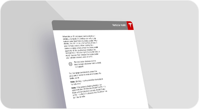 Vehicle Hold When Model 3 is stopped, Vehicle Hold can continue to apply the brakes even after you remove your foot from the brake pedal. When driving on a hill or on a flat surface, brake as you normally would. After coming to a complete stop, simply press the brake pedal again (until the touchscreen displays the Vehicle Hold indicator light) to enable Vehicle Hold. You can then release the brake pedal and remain stopped, even on a hill. This indicator displays on the touchscreen whenever Vehicle Hold is engaged. To disengage Vehicle Hold, press the accelerator pedal or press and release the brake pedal. Note: Shifting into Neutral also disengages Vehicle Hold. Note: After actively braking Model 3 for approximately 10 minutes, Model 3 shifts into Park and Vehicle Hold cancels. Model 3 also shifts into Park if it detects that the driver has left the vehicle. Driving 51