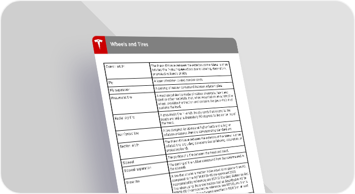 Wheels and Tires Overall width The linear distance between the exteriors of the sidewalls of an inflated tire, including elevations due to labeling, decorations, or protective bands or ribs. Ply A layer of rubber-coated parallel cords. Ply separation A parting of rubber compound between adjacent plies. Pneumatic tire A mechanical device made of rubber, chemicals, fabric and steel or other materials, that, when mounted on an automotive wheel, provides the traction and contains the gas or fluid that sustains the load. Radial ply tire A pneumatic tire in which the ply cords that extend to the beads are laid at substantially 90 degrees to the center line of the tread. Reinforced tire A tire designed to operate at higher loads and at higher inflation pressures than the corresponding standard tire. Section width The linear distance between the exteriors of the sidewalls of an inflated tire, excluding elevations due to labeling, decoration, or protective bands. Sidewall The portion of a tire between the tread and bead. Sidewall separation The parting of the rubber compound from the cord material in the sidewall. Snow tire A tire that attains a traction index equal to or greater than 110, compared to the ASTM E1136-93 (re-approved 2003, incorporated by reference, see §571.5) Standard Reference Test Tire when using the snow traction test as described in ASTM F1805-00 (incorporated by reference, see §571.5), and that is marked with an Alpine Symbol specified in S5.5(i) on at least one sidewall. Test rim The rim on which a tire is fitted for testing, and may be any rim listed as appropriate for use with that tire. Tread The portion of a tire that comes into contact with the road. Tread rib A tread section running around the circumference of a tire. Tread separation The pulling away of the tread from the tire carcass. Tread wear indicators (TWI) The projections within the principal grooves designed to give a visual indication of the degrees of wear of the tread. Wheel-holding fixture The fixture used to hold the wheel and tire assembly securely during testing. 144 Model 3 Owner's Manual