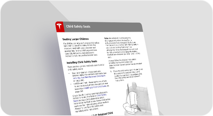 Child Safety Seats Seating Larger Children Note: An automatic locking retractor disengages only when the seat belt is If a child is too large to fit into a child safety unbuckled and fully retracted. The belt can seat, but too small to safely fit into the then be worn as a normal belt, sliding freely in standard seat belts, use a booster seat and out and locking tight only in an appropriate for the child†s age and size. emergency. Once disengaged, the belt must Carefully follow the manufacturer†s be fully extended to re-engage the locking instructions to secure the booster seat. mechanism whenever you install a child safety seat. Installing Child Safety Seats Always follow the detailed instructions There are two general methods used to install provided by the child safety seat child safety seats: manufacturer. General guidelines are provided below. • Seat belt retained - these seats are 1. Place the child safety seat in Model 3, and secured using the vehicle†s seat belts (see fully extend the seat belt. Route and Installing Seat Belt Retained Child Seats buckle the seat belt in accordance with on page 26). the child safety seat manufacturer†s • LATCH retained - these seats can attach instructions. to anchor bars built into the vehicle†s rear seats (see Installing LATCH Child Seats on page 26). Check the child safety seat manufacturer†s instructions and the table at Child Safety Seats on page 24 to determine which installation method to use. Some child safety seats can be installed using either method. Always follow the child safety seat manufacturer†s instructions. Installing Seat Belt Retained Child Seats First, make sure that the child safety seat is appropriate for the weight, height, and age of the child. 2. Allow the seat belt to retract, and remove Avoid dressing the child in bulky clothing and all slack in the seat belt while firmly do not place any objects between the child pushing the child safety seat into the and the restraint system. Model 3 seat. Adjust harnesses for every child, every trip. 3. If the seat belt retained child safety seat has an upper tether, attach it to the back To securely hold child safety seats, all of the seat (see Attaching Upper Tether passenger seating positions are equipped with Straps on page 27). an automatic locking retractor (ALR) that, by pulling the seat belt beyond the length Installing LATCH Child Seats needed for a typical adult occupant, locks the belt into place until the seat belt is unbuckled Lower LATCH anchors are provided in the and the webbing is fully retracted. The ALR second row outboard seats. The anchors are mechanism operates as a ratchet, winding in located between the seat's back rest and rear slack and preventing the seat belt from cushion. The exact location of each anchor is extending any further until it has been identified by a child safety seat identification completely rewound. When installing a child button, illustrated below. The button is located safety seat, engage the belt's automatic on the seat back, directly above its associated locking retractor by pulling the seat belt anchor. webbing until it is fully extended. The ALR system engages only when the seat belt is at its maximum extension point. 26 Model 3 Owner's Manual