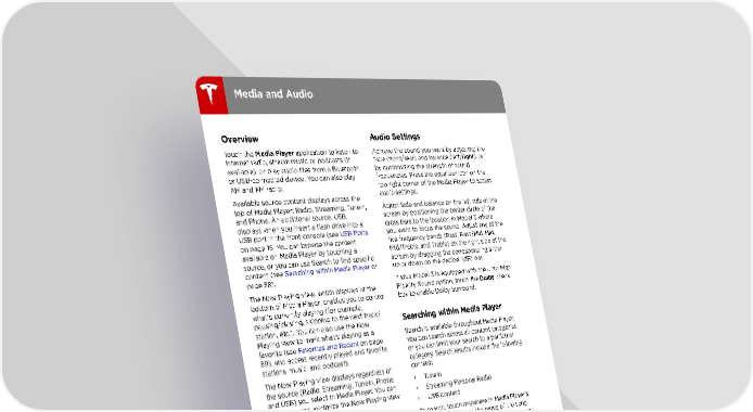 Media and Audio Overview Audio Settings Touch the Media Player application to listen to Achieve the sound you want by adjusting the Internet radio, stream music or podcasts (if fade (front/rear) and balance (left/right), or available), or play audio files from a Bluetooth by customizing the strength of sound or USB-connected device. You can also play frequencies. Press the equalizer icon on the AM and FM radio. top right corner of the Media Player to access Available source content displays across the audio settings. top of Media Player: Radio, Streaming, TuneIn, Adjust fade and balance on the left side of the and Phone. An additional source, USB, screen by positioning the center circle of the displays when you insert a flash drive into a cross bars to the location in Model 3 where USB port in the front console (see USB Ports you want to focus the sound. Adjust any of the on page 16. You can browse the content five frequency bands (Bass, Bass/Mid, Mid, available on Media Player by touching a Mid/Treble, and Treble) on the right side of the source, or you can use Search to find specific screen by dragging the corresponding slider content (see Searching within Media Player on up or down on the decibel (dB) bar. page 88). If your Model 3 is equipped with the Ultra High The Now Playing view, which displays at the Fidelity Sound option, touch the Dolby check bottom of Media Player, enables you to control box to enable Dolby Surround. what's currently playing (for example, pausing/playing, skipping to the next track/ Searching within Media Player station, etc.). You can also use the Now Playing view to mark what's playing as a Search is available throughout Media Player. favorite (see Favorites and Recent on page You can search across all content categories, 89), and access recently played and favorite or you can limit your search to a particular stations, music, and podcasts. category. Search results include the following The Now Playing view displays regardless of content: the source (Radio, Streaming, TuneIn, Phone, • TuneIn and USB) you select in Media Player. You can • Streaming Personal Radio maximize and minimize the Now Playing view • USB content simply by touching it. To search, touch anywhere in Media Player's Volume Control search bar and enter the name of the song, album, artist, podcast, playlist, or station you To adjust Media Player's volume, you can roll want to search for. Select a filter to narrow the the scroll wheel on the left side of the steering scope of your search, or leave it at its default wheel up (increase volume) or down setting to include top results from all (decrease volume). To mute the volume, press categories. the left scroll button. You can also adjust the If you are using TuneIn, you can browse volume by pressing the arrow above (increase content by category from the Browse area of volume) or below (decrease volume) the the TuneIn source. You can browse content by speaker icon on the bottom of the location (Africa, Asia, North America, and so touchscreen. on), by local radio, by talk radio, by favorites, The scroll wheel adjusts the volume for media, and other categories. To return from browsing navigation instructions, or phone calls, based or to select another category to browse, on what is currently being heard through the simply touch TuneIn at the top of Media speakers. If you're listening to a song, audio Player. file, or podcast, and you receive a phone call or Model 3 relays a step in Trip Planner's turn- by-turn directions through the speakers, the song, audio file, or podcast is muted temporarily. Note: Pressing the left scroll button during a phone call mutes both the sound and your microphone. 88 Model 3 Owner's Manual