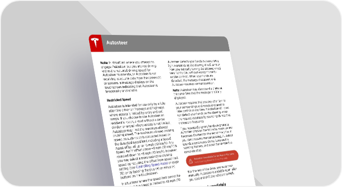 Autosteer Note: In situations where you attempt to Autosteer detects your hands by recognizing engage Autosteer, but you are not driving light resistance as the steering wheel turns or within the required driving speed for from you manually turning the steering wheel Autosteer to operate, or Autosteer is not very lightly (i.e., without enough force to receiving adequate data from the camera(s) retake control). When your hands are or sensors, a message displays on the detected, the message disappears and touchscreen indicating that Autosteer is Autosteer resumes normal operation. temporarily unavailable. Note: Autosteer may also sound a chime at Restricted Speed the same time that the message is initially displayed. Autosteer is intended for use only by a fully Autosteer requires that you pay attention to attentive driver on freeways and highways your surroundings and remain prepared to where access is limited by entry and exit take control at any time. If Autosteer still does ramps. If you choose to use Autosteer on not detect your hands on the steering wheel, residential roads, a road without a center the request escalates by sounding chimes that divider, or a road where access is not limited, increase in frequency. Autosteer may limit the maximum allowed cruising speed. The maximum allowed cruising If you repeatedly ignore hands-on prompts, speed on such roads is calculated based on Autosteer displays the following message and the detected speed limit including a Speed becomes disabled for the rest of the drive. If Assist offset of up to +5 mph (10 km/h). Any you don't resume manual steering, Autosteer Speed Assist offset above +5 mph (10 km/h) is sounds a continuous chime, turns on the rounded down to +5 mph (10 km/h). However, warning flashers, and slows the vehicle to a you may select a more restrictive cruising complete stop. speed by reducing the offset from speed limit setting (see Controlling Speed Assist on page 78) or by tapping the plus (+) or minus (-) buttons on the touchscreen. In situations where the speed limit cannot be For the rest of the drive, you must steer detected, the speed is limited to 45 mph (70 manually. Autosteer is available again after km/h). you stop and shift the vehicle into Park. When Autosteer is engaged in these Take Over Immediately situations, it reduces your driving speed and your set speed to be within these limits. You In situations where Autosteer is unable to can manually accelerate to exceed the limited steer Model 3, Autosteer sounds a warning speed, but when you release the accelerator chime and displays the following message on pedal, Autosteer slows Model 3 to the limited the touchscreen: speed. When you leave the road, or disengage Autosteer by using the steering wheel, you can increase your set speed again, if desired. Hold Steering Wheel Autosteer uses data from the camera(s), When you see this message, TAKE OVER sensors, and GPS to determine how best to STEERING IMMEDIATELY. steer Model 3. When active, Autosteer requires you to hold the steering wheel. If it does not Canceling Autosteer detect your hands on the steering wheel for a period of time, a flashing white light appears Autosteer cancels when: on the touchscreen and the following message • You start steering manually. displays: • You press the brake pedal. • You unbuckle the driver's seat belt. • The maximum speed that Autosteer supports–90 mph (150 km/h)–is exceeded. • You move the gear lever upwards. 64 Model 3 Owner's Manual