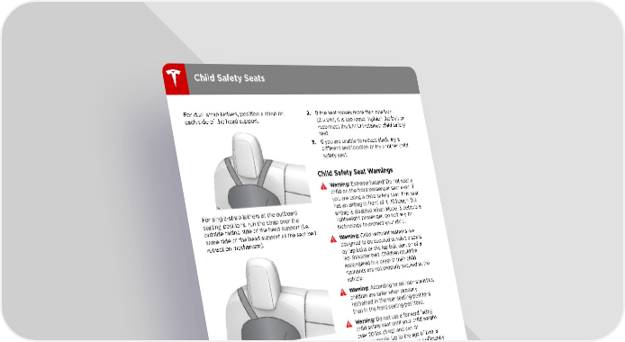 Child Safety Seats For dual-strap tethers, position a strap on 2. If the seat moves more than one inch each side of the head support. (2.5 cm), it is too loose. Tighten the belt or reconnect the LATCH retained child safety seat. 3. If you are unable to reduce slack, try a different seat location or try another child safety seat. Child Safety Seat Warnings Warning: Extreme hazard! Do not seat a child on the front passenger seat even if you are using a child safety seat. This seat For single-strap tethers at the outboard has an airbag in front of it. Although this seating positions, run the strap over the airbag is disabled when Model 3 detects a outside-facing side of the head support (i.e. lightweight passenger, do not rely on same side of the head support as the seat belt technology to protect your child. retraction mechanism). Warning: Child restraint systems are designed to be secured in vehicle seats by lap belts or the lap belt portion of a lap-shoulder belt. Children could be endangered in a crash if their child restraints are not properly secured in the vehicle. Warning: According to collision statistics, children are safer when properly restrained in the rear seating positions than in the front seating positions. Warning: Do not use a forward facing child safety seat until your child weighs For a single-strap tether in the center seating over 20 lbs (9 kg) and can sit position, fully lower the head support (see independently. Up to the age of two, a Raising/Lowering the Rear Center Head child's spine and neck are not sufficiently Support on page 20) and run the strap over developed to avoid injury in a frontal the top center of the head support. impact. Warning: Do not allow a baby or infant to be held on a lap. All children should be restrained in an appropriate child safety seat at all times. Warning: To ensure children are safely seated, follow all instructions provided in this document and by the manufacturer of the child safety seat. Warning: Children should ride in a rear facing child safety seat using the seat†s integrated 5-point harness for as long as possible. Warning: Do not use seat belt extenders Testing a Child Safety Seat on a seat belt that is being used to install Before seating a child, always make sure the a child safety seat or booster seat. child safety seat is not loose: Warning: When seating larger children, 1. Hold the child safety seat by the belt path make sure the child's head is supported and try to slide the safety seat from side and the child†s seat belt is properly to side and front to back. adjusted and fastened. The shoulder portion of the belt must be away from the 28 Model 3 Owner's Manual