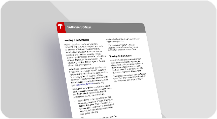 Software Updates Loading New Software not installed. Reverting to a previous software version is not possible. Model 3 updates its software wirelessly, If the touchscreen displays a message providing new features throughout your term indicating that a software update was not of ownership. Tesla recommends that you successfully completed, contact Tesla. install software updates as soon as they are available. The first time you enter Model 3 after an update is made available, a scheduling Viewing Release Notes window displays on the touchscreen. The scheduling window displays again at the end When a software update is complete, learn of your first driving session. about the new features by displaying the Note: Some software updates can take up to release notes. To display release notes about three hours to complete. Model 3 must be in your current software version at any time Park while the new software is being installed. touch the Tesla “T” at the top center of the To ensure the fastest and most reliable touchscreen, then touch Release Notes. delivery of software updates, leave the Wi-Fi Tesla strongly recommends reading all release turned on and connected whenever possible notes. They may contain important safety or (see Connecting to Wi-Fi on page 101). user information regarding your Model 3. When a software update is available, a yellow clock icon appears on the touchscreen†s status bar. Touch this clock icon to display the update window. You can then either: • Schedule the update by setting the time you want the update to begin. Then touch Set For This Time. Once scheduled, the yellow clock icon changes to a white clock icon. You can reschedule the update any time before it begins. OR • Touch Install Now to immediately start the update process. If Model 3 is charging when the software update begins, charging stops. Charging resumes automatically when the software update is complete. If you are driving Model 3 at the scheduled update time, the update is canceled and you need to reschedule it. Note: Over time, the touchscreen may display a software update window informing you to SET FOR THIS TIME or INSTALL NOW. This software update window will persist until you complete the installation of the software update. You must install all software updates as soon as they are available and any harm relating to the failure to install a software update will not be covered by the vehicle†s warranty. Failure or refusal to install such updates may result in the inaccessibility of certain vehicle features (including incompatibility with digital media devices) or in Tesla being unable to diagnose and service your vehicle. Note: Certain vehicle features may become inaccessible (including incompatibility with digital media devices) if software updates are 102 Model 3 Owner's Manual