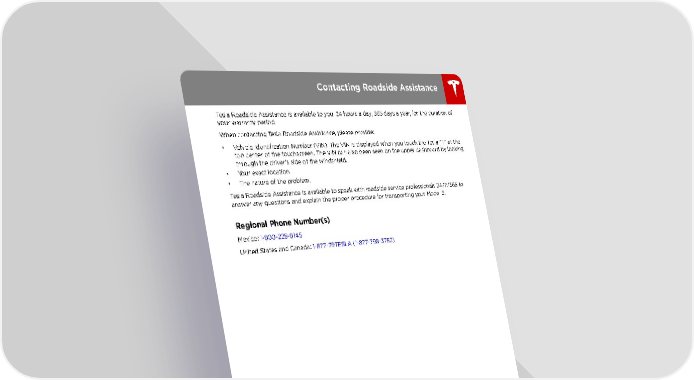 Contacting Roadside Assistance Tesla Roadside Assistance is available to you, 24 hours a day, 365 days a year, for the duration of your warranty period. When contacting Tesla Roadside Assistance, please provide: • Vehicle Identification Number (VIN). The VIN is displayed when you touch the Tesla "T" at the top center of the touchscreen. The VIN can also been seen on the upper dashboard by looking through the driver's side of the windshield. • Your exact location. • The nature of the problem. Tesla Roadside Assistance is available to speak with roadside service professionals 24/7/365 to answer any questions and explain the proper procedure for transporting your Model 3. Regional Phone Number(s) Mexico: 1-800-228-8145 United States and Canada: 1-877-79TESLA (1-877-798-3752) Roadside Assistance 145