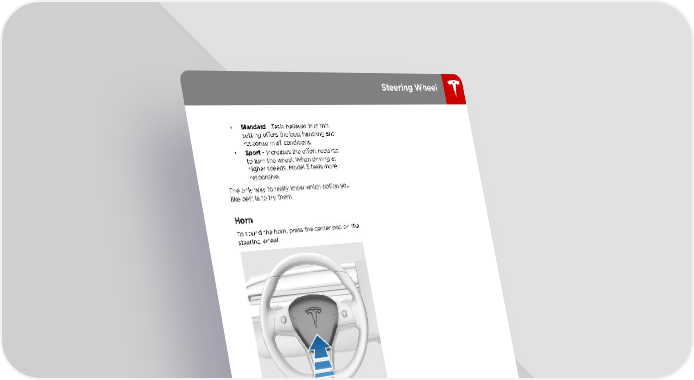 Steering Wheel • Standard - Tesla believes that this setting offers the best handling and response in all conditions. • Sport - Increases the effort required to turn the wheel. When driving at higher speeds, Model 3 feels more responsive. The only way to really know which option you like best is to try them. Horn To sound the horn, press the center pad on the steering wheel. Driving 35