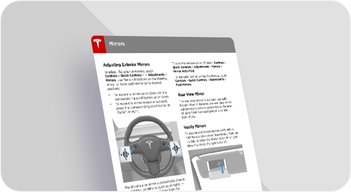 Mirrors Adjusting Exterior Mirrors To turn this feature on or off, touch Controls > To adjust the exterior mirrors, touch Quick Controls > Adjustments > Mirrors > Controls > Quick Controls > > Adjustments > Mirror Auto Fold. Mirrors. Use the scroll buttons on the steering To manually fold or unfold the mirrors, touch wheel to move each mirror to its desired Controls > Quick Controls > Adjustments > position: Fold Mirrors. • To move the mirror up or down, roll the Rear View Mirror corresponding scroll button up or down. • To move the mirror inward or outward, The rear view mirror is adjusted manually. press the corresponding scroll button to Except when in Reverse, the rear view mirror the left or right. automatically dims in proportion to the level of glare from the headlights of a vehicle behind you. Vanity Mirrors To expose and illuminate the vanity mirror, fold the sun visor down toward you, then use the tab to lower the mirror cover. When you close the cover, the light turns off. The driver†s side mirror automatically dims in low lighting conditions (such as at night), in proportion to the level of glare from the headlights of a vehicle behind you (except when in Reverse). Mirror Auto Tilt Both exterior mirrors can automatically tilt downward when Model 3 is shifted into Reverse. To adjust the auto-tilt position, shift into Reverse, then adjust the mirrors as described above. When you shift back into Drive, the mirrors tilt back to their normal (upward) position. After you have adjusted the exterior mirrors for backing up, they automatically tilt to the adjusted downward position whenever you shift into Reverse. To turn this feature on or off, touch Controls > Quick Controls > Adjustments > Mirrors > Mirror Auto Tilt. Mirror Auto Fold Both exterior mirrors can automatically fold inward whenever you exit and lock Model 3. When you unlock Model 3, the exterior mirrors automatically unfold. 36 Model 3 Owner's Manual